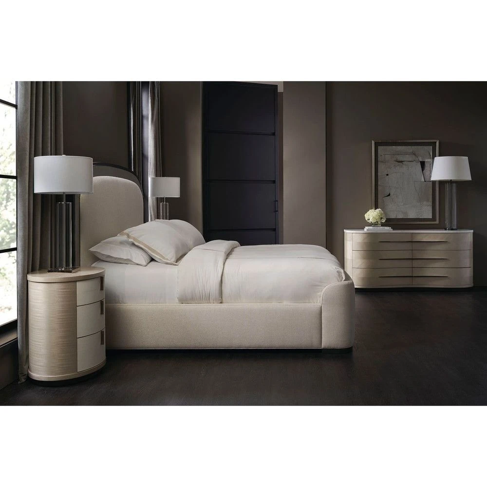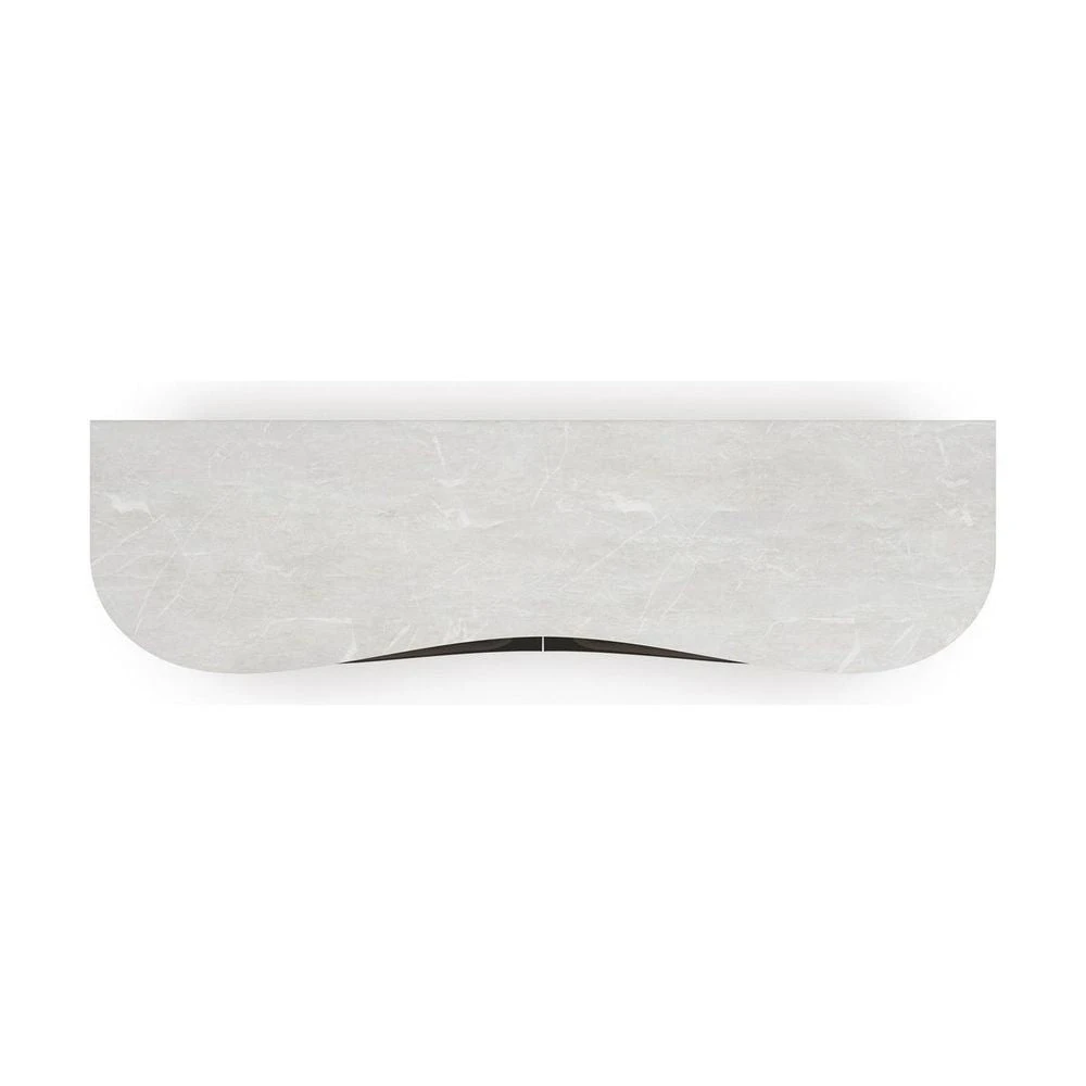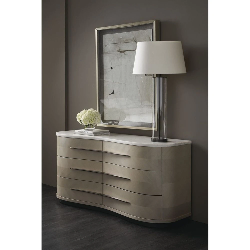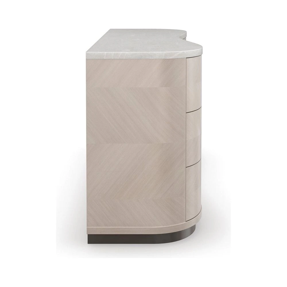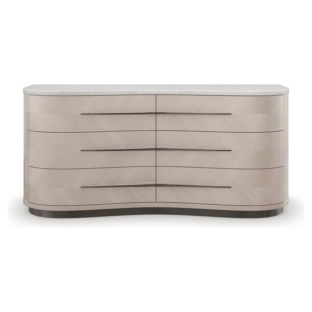 Sleek and sinuous in a pearlescent Moonstone finish, this dresser introduces an elegant form with organic simplicity. Chevron-patterned Koto veneers highlight its fluidity, defined by six gently curving, soft-close drawers with horizontal hardware in a Deep Bronze finish. A White Rhino marble top adds a touch of luxe and durable top surface. With ample potential for style and storage, Roam is a naturally appealing addition to bedrooms and living interiors.