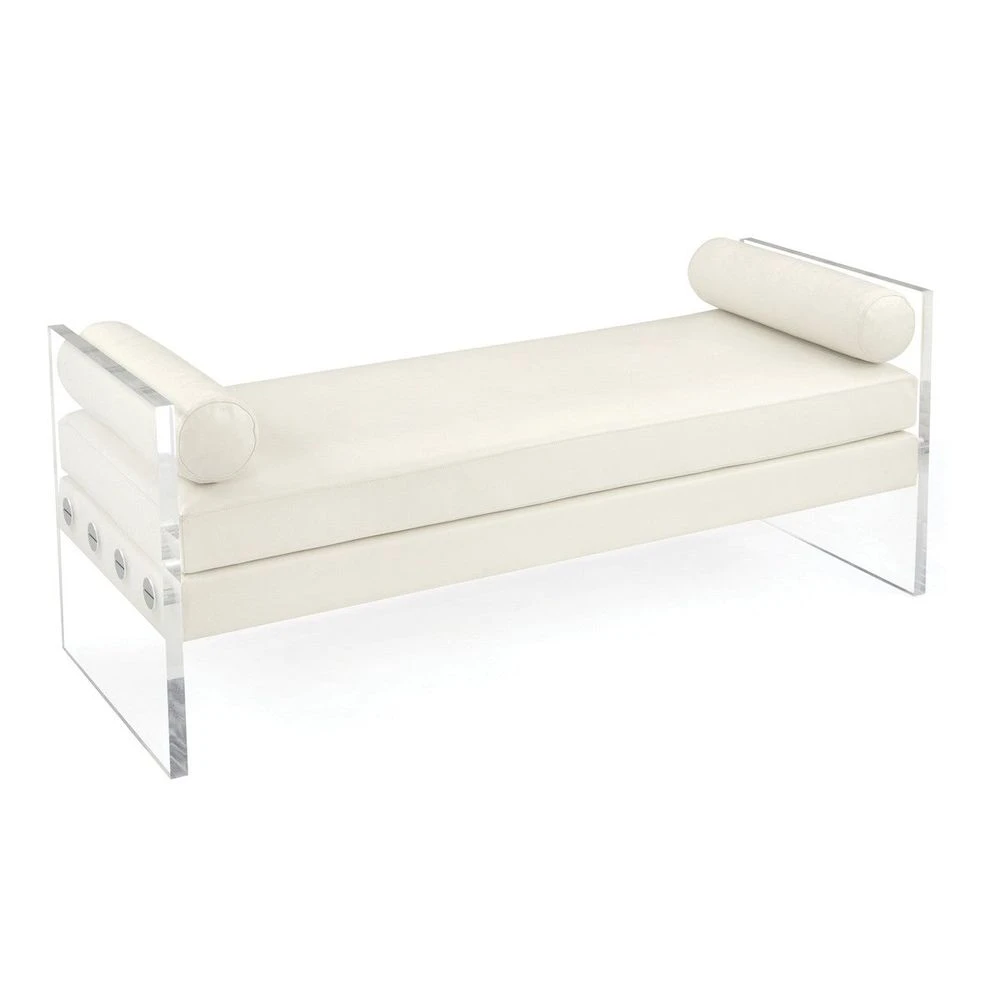 Description: This bench features a fully upholstered seat and bolsters, with lucite ends secured by decorative bolt heads in polished stainless steel.
