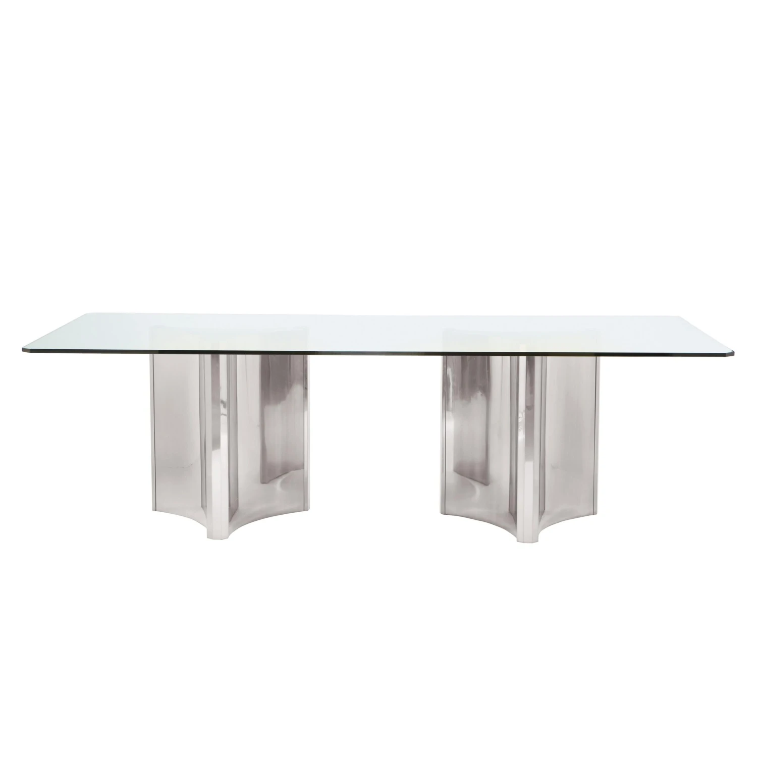 Description: The Felixdining table boldly showcases a rectangular glass top supported by two sculptural steel pedestals, making a sophisticated statement in any dining room. A polished stainless steel finish enhances the glamour.