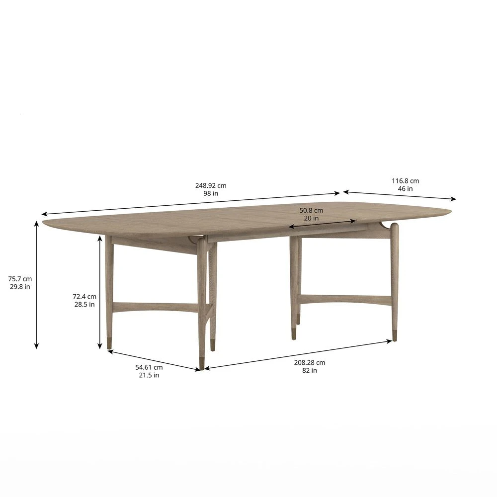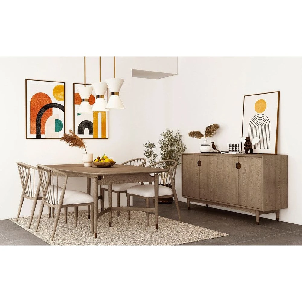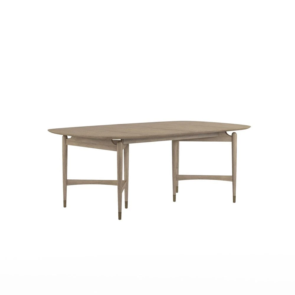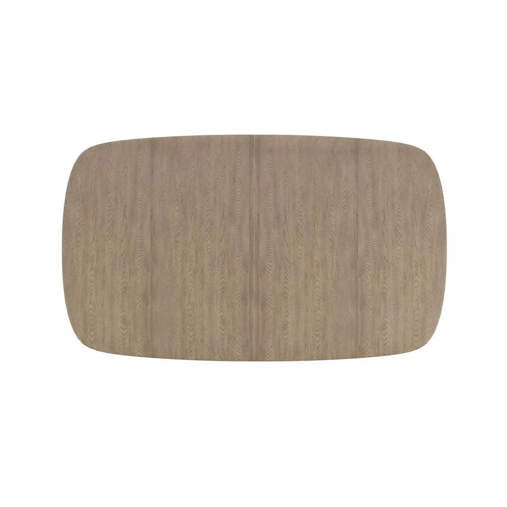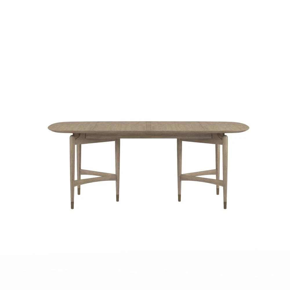 Dine in style at this eye-catching table, featuring meticulously crafted details that look beautiful from every angle. A boldly angular base is softened by vintage-inspired details such as tapered legs with metal ferrules, subtly arched supports, and rounded tabletop corners that deliver an iconic sense of mid century style. A warm grey elm veneer completes the look in modern style.