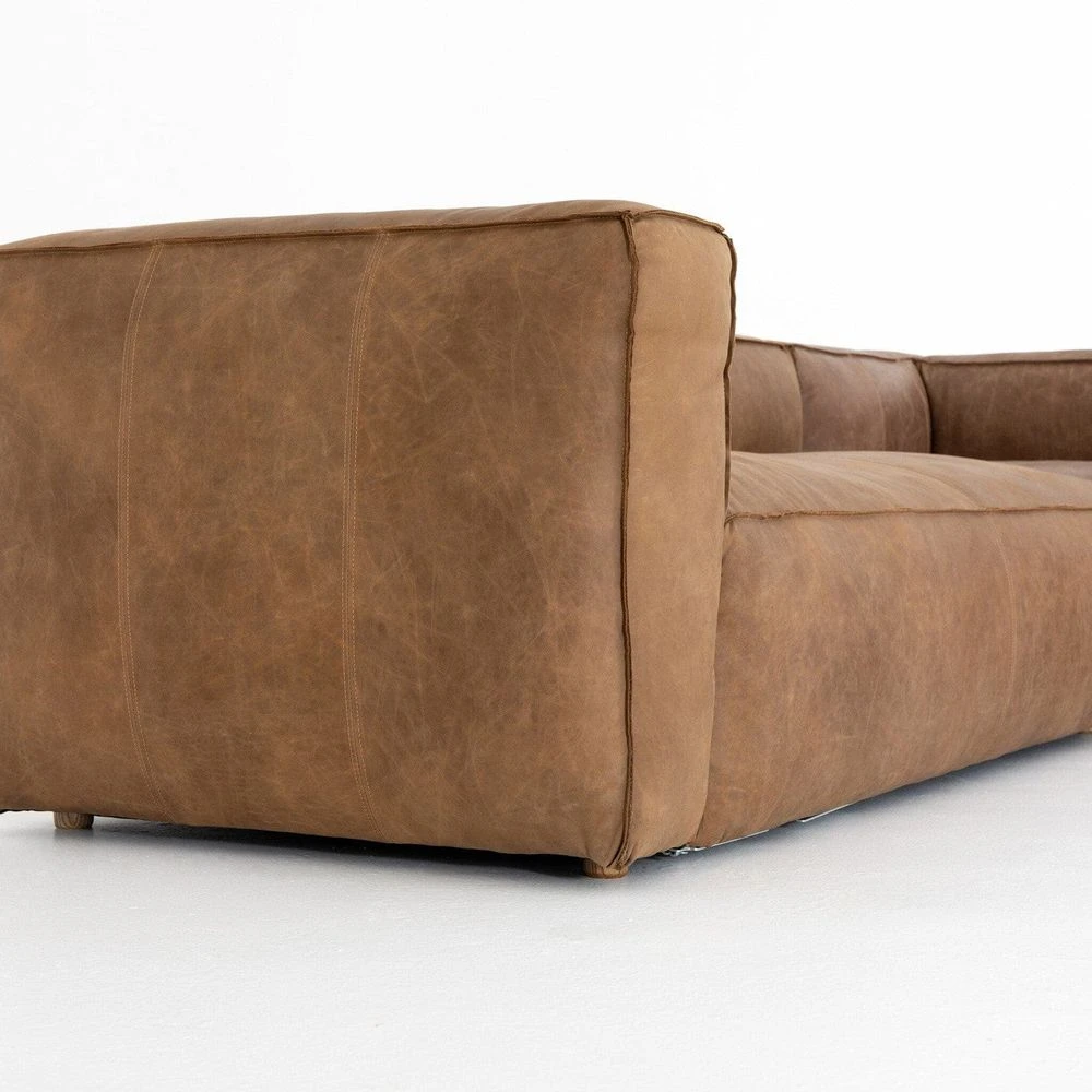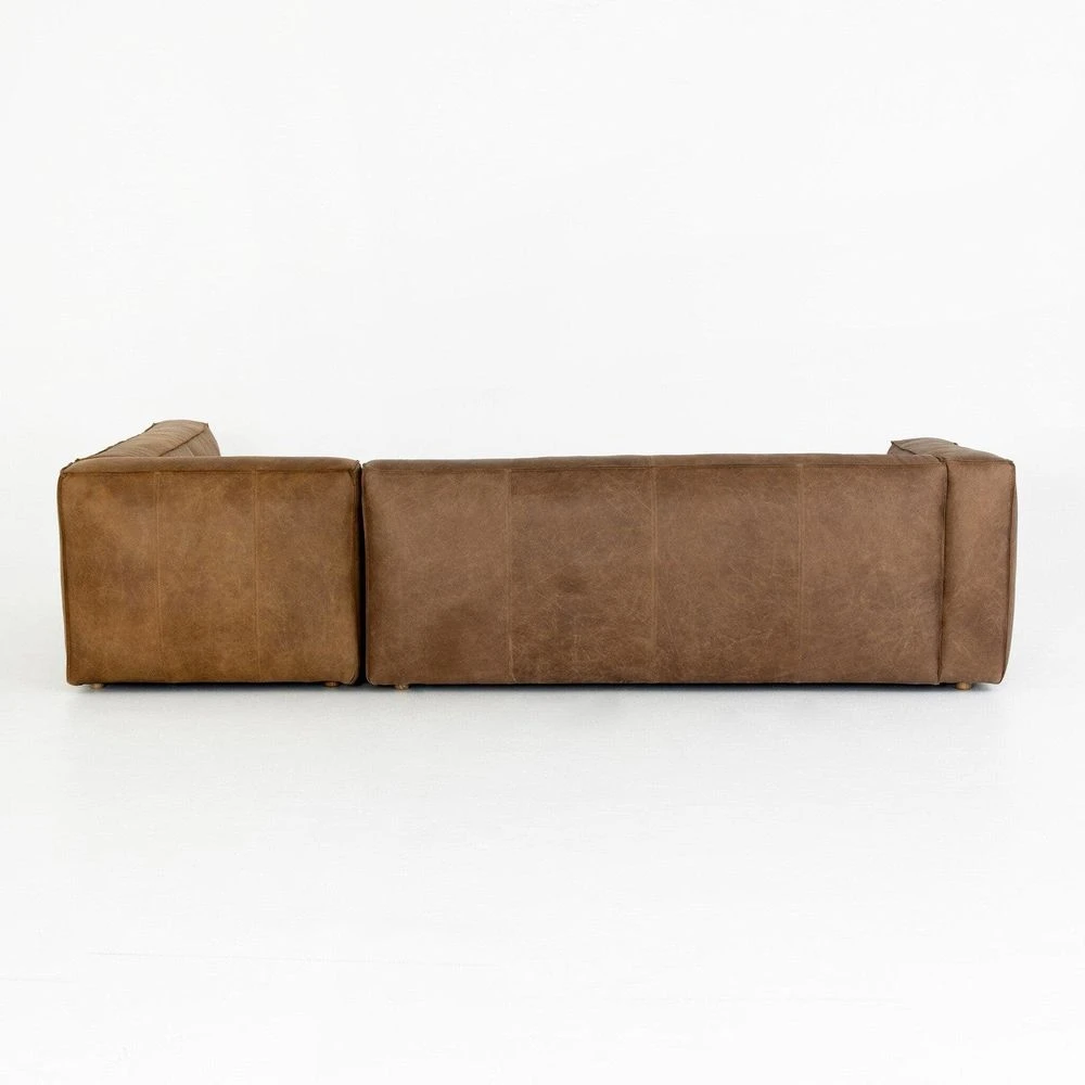 - Description: Timeless comfort is captured in this favorite sectional. Clean lines, sleek cushioning and refined arms are covered in tan, natural wash top-grain leather. Left arm facing piece two-piece sectional.