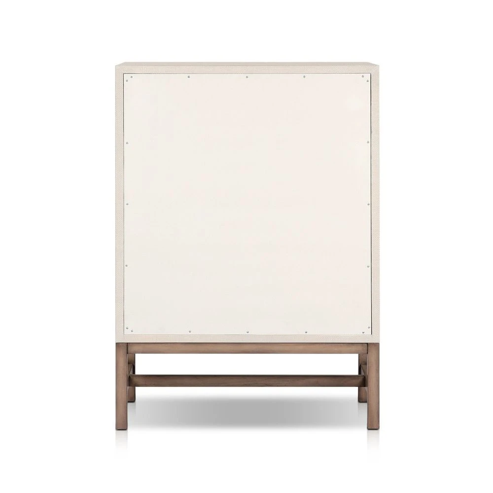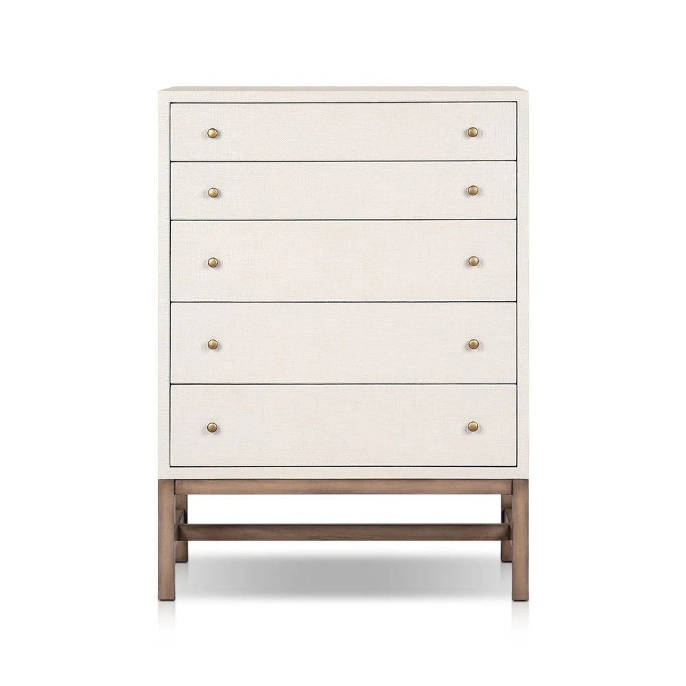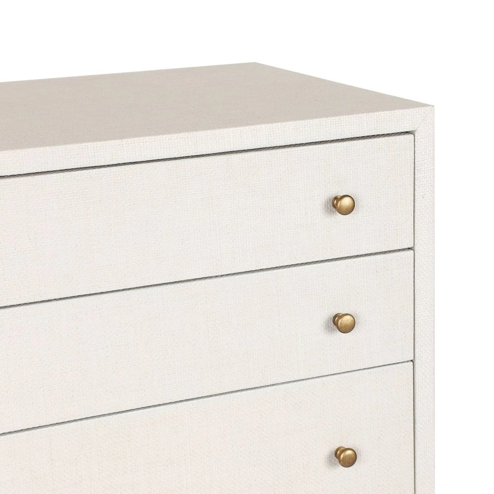 Description: An ivory-painted raffia dresser offers a texture-driven take on bedroom storage. Antique brass-finished hardware adds a touch of vintage detailing, all grounded by a solid mahogany base.