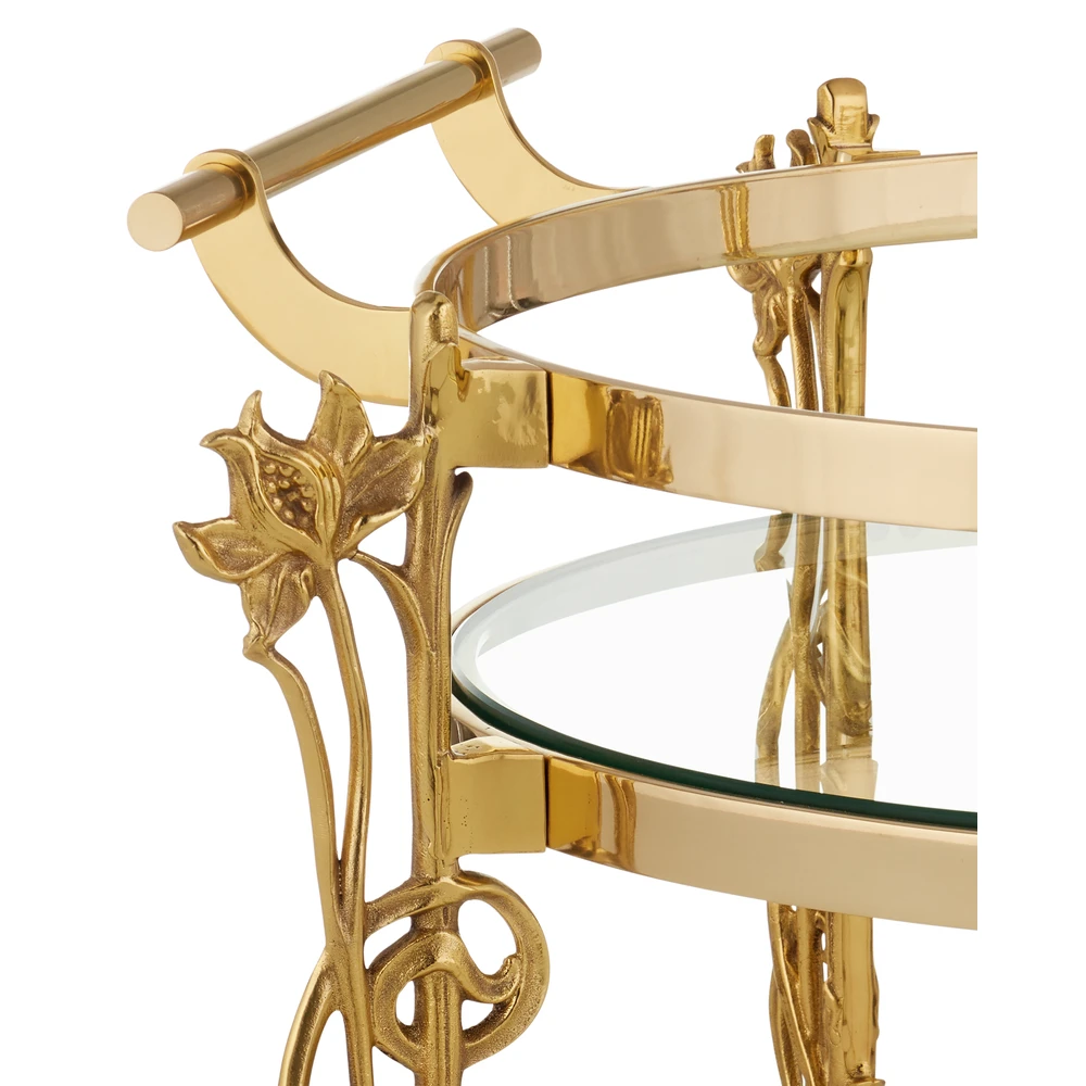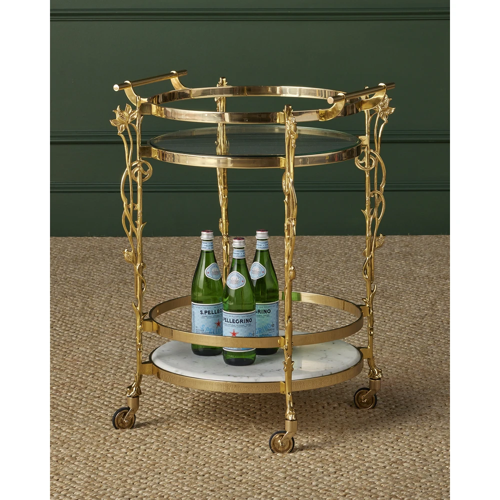 Description: Reflecting its beautiful name, which means flower in Italian, the Fiore Bar Cart has lovely floral motifs flowing up each of its legs toward a metal band into which a glass top is inset. Just above the graceful ball-shaped feet fitted with non-marring casters sits a natural white marble shelf, the stone a crisp contrast to the luminous polished brass finish.
