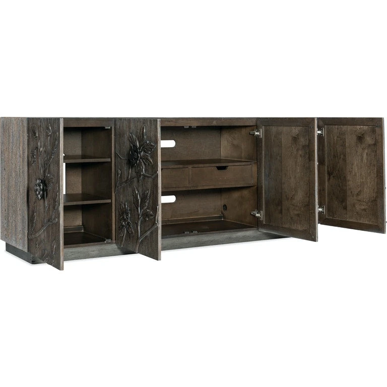 - Finish: Medium wood finish with flower motif on door fronts and large floral silver hardware