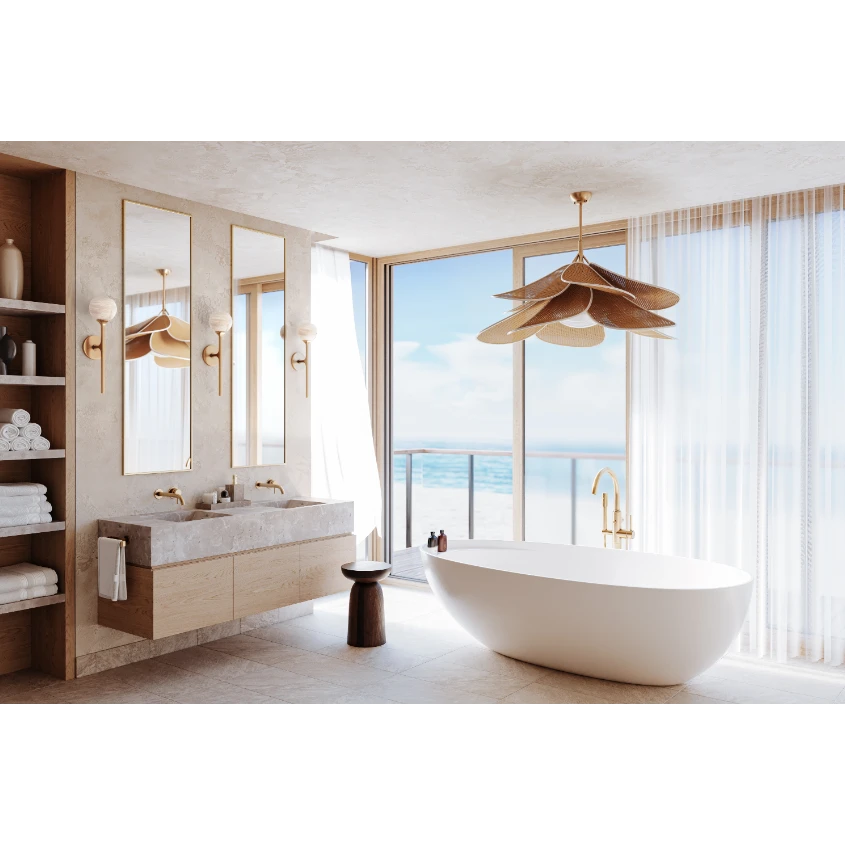 Petals of natural rattan caning are trimmed in white cotton and layered around an opal glossy glass globe to give Florina its airy, natural floral aesthetic.