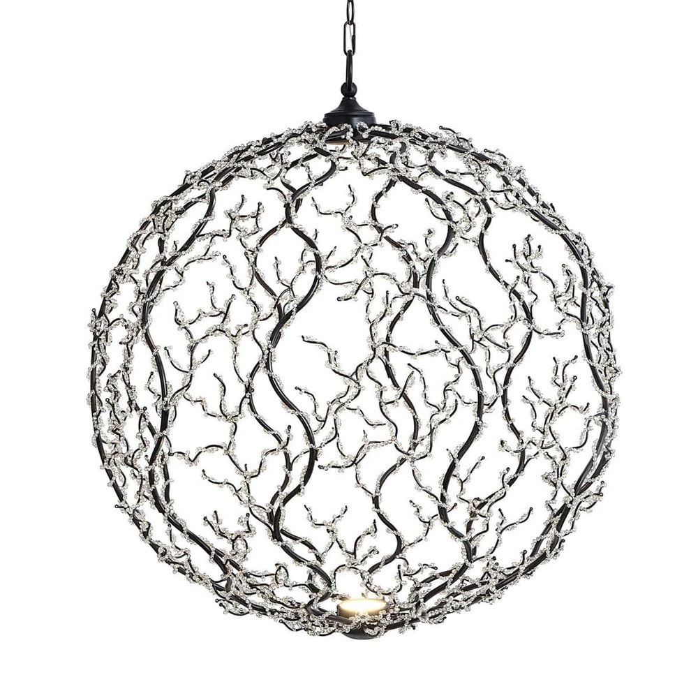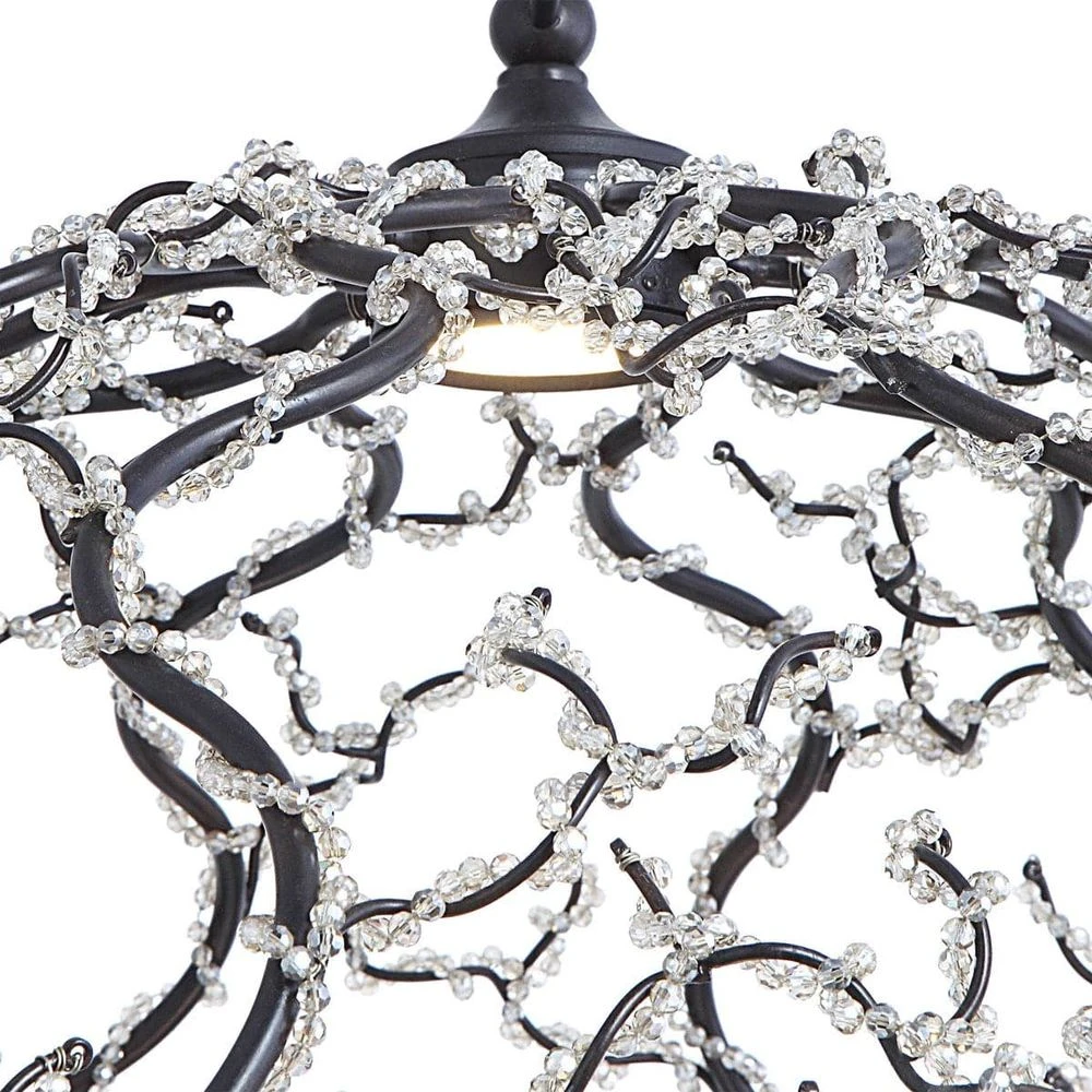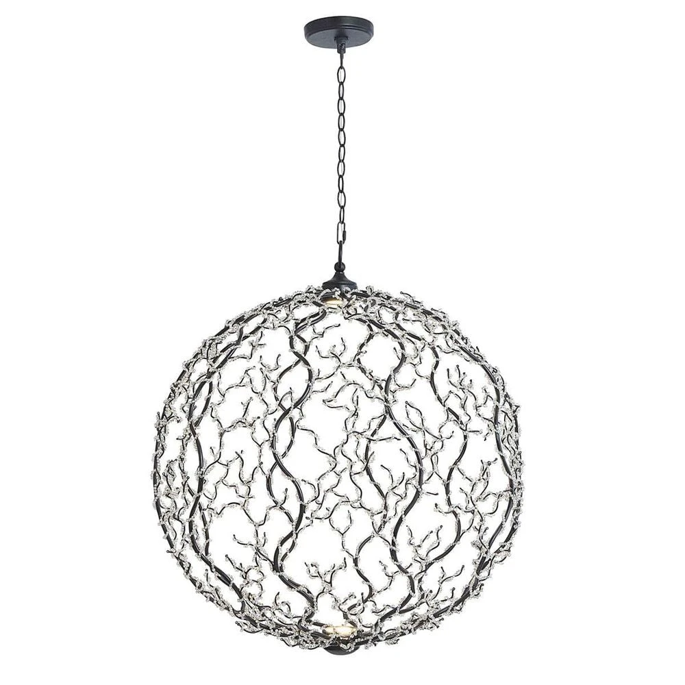 A beautiful orb in a rich oil rubbed bronze finish that plays up a botanical feel with the look of vines growing up & around woven with elegant cognac crystal beads. Light radiates inside from the 2-22w COB Dimmable LEDs included. It has 3000K,CRI of 80, 30,000 hour life and is dimmable with a Lutron SKYLARK SCL-153P Dimmer. Supplied with 15′ wire & 7′ chain.