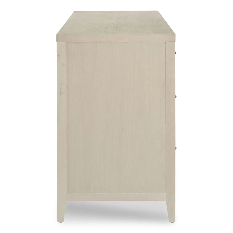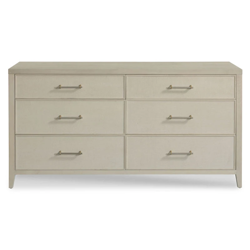 A terrific storage chest with six individual drawers mounted with sturdy pulls over a raffia drawer face flanked by squared corner posts.