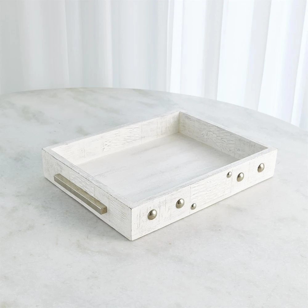 Description: Our Fort Tray is made from mango wood with a distressed white finish and features nickel finished iron embellishments.