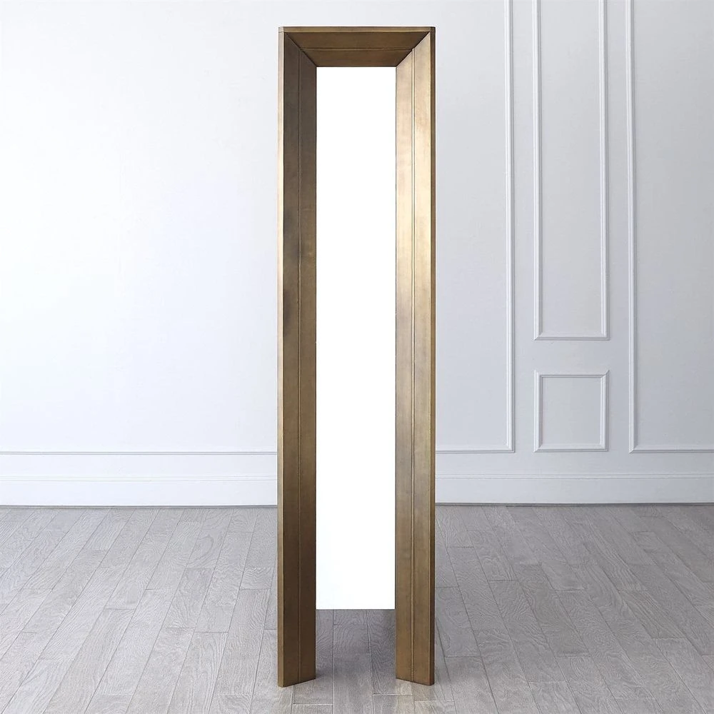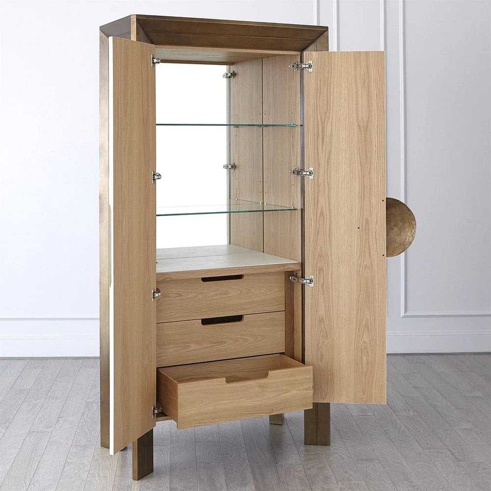 The Framed Tall Cabinet is made of hardwood construction with brass sheeting and cast resin panels, lined in American white oak with white marble counter and brass media grommet. Includes soft-close doors and drawers and glass shelves.