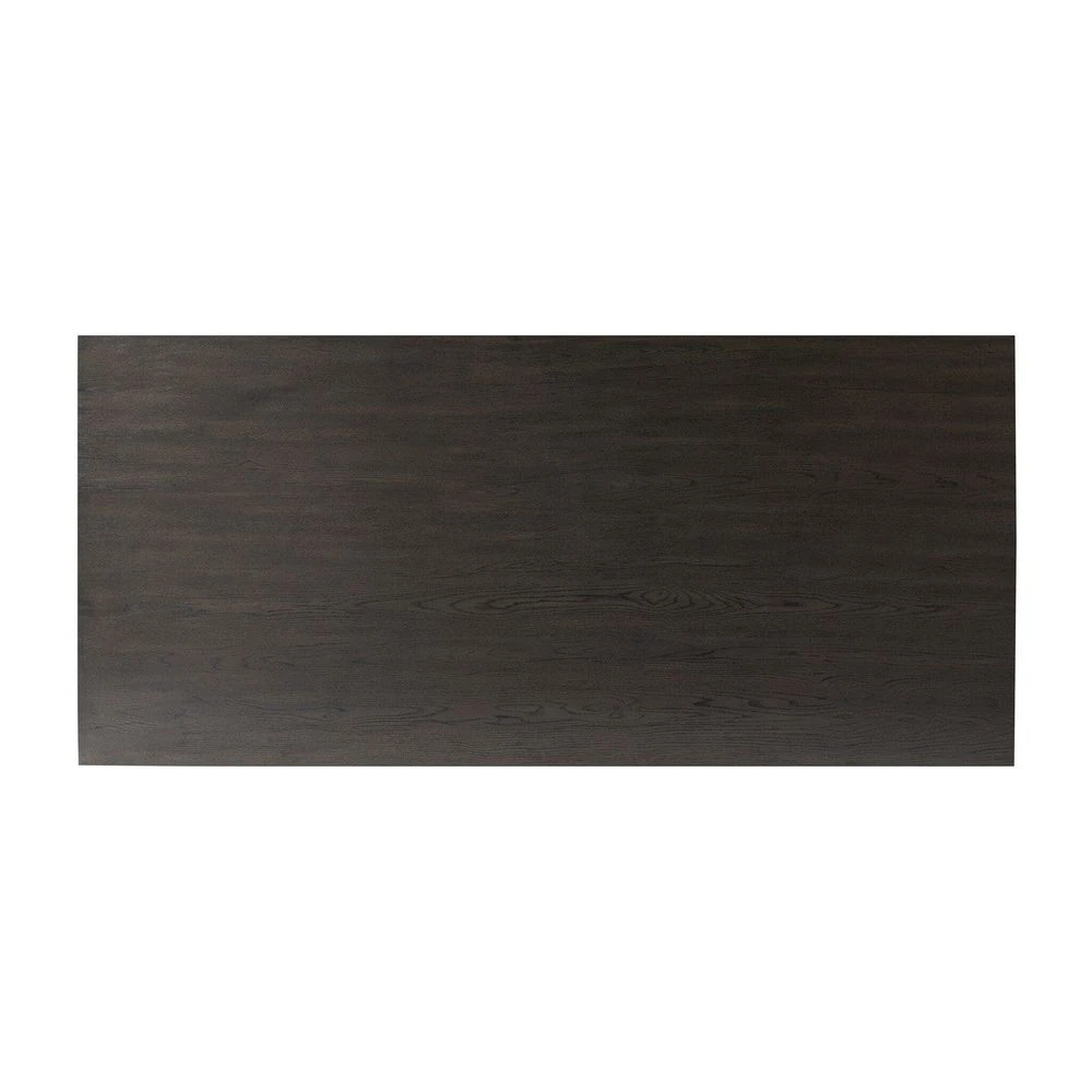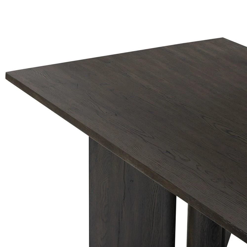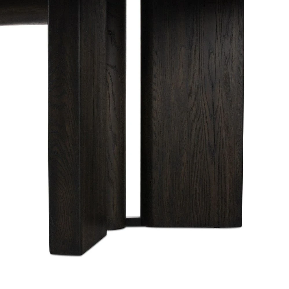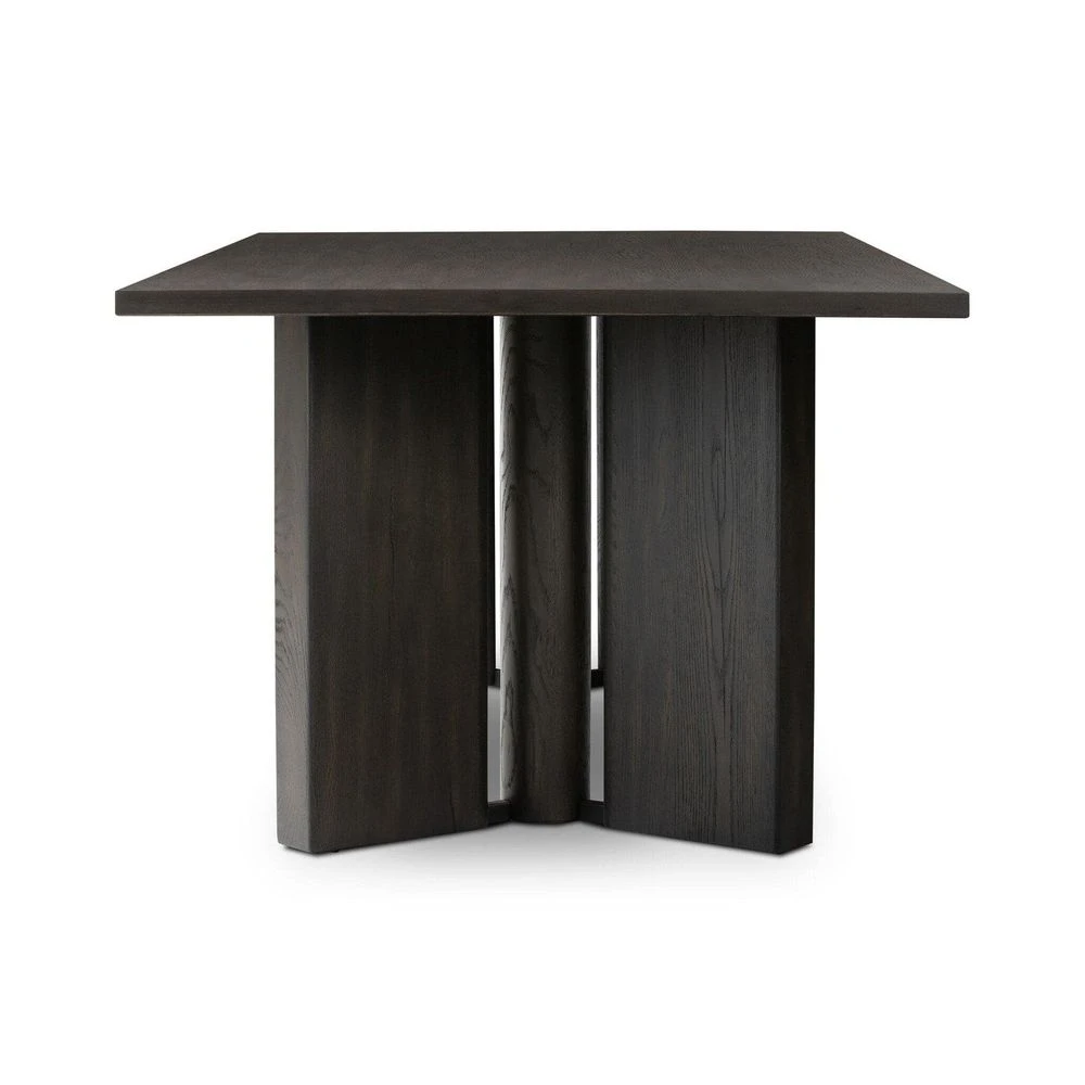 Description: A smoked black finish delivers a character-rich look to an open-style dining table. Angled panel legs separated by a round cylinder up the intrigue factor.