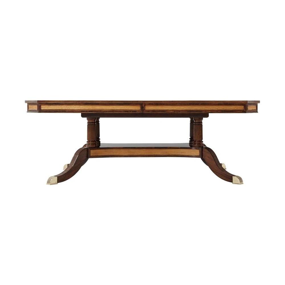 A mahogany and swirl veneered and cross-banded extending dining table, the rectangular top opening to accommodate two additional self storing leaves, the paneled satinwood veneered frieze above a bold base of four turned reeded columns on a platform base issuing four out-swept legs with brass cappings.