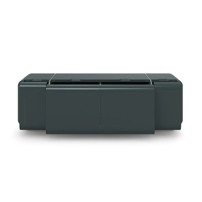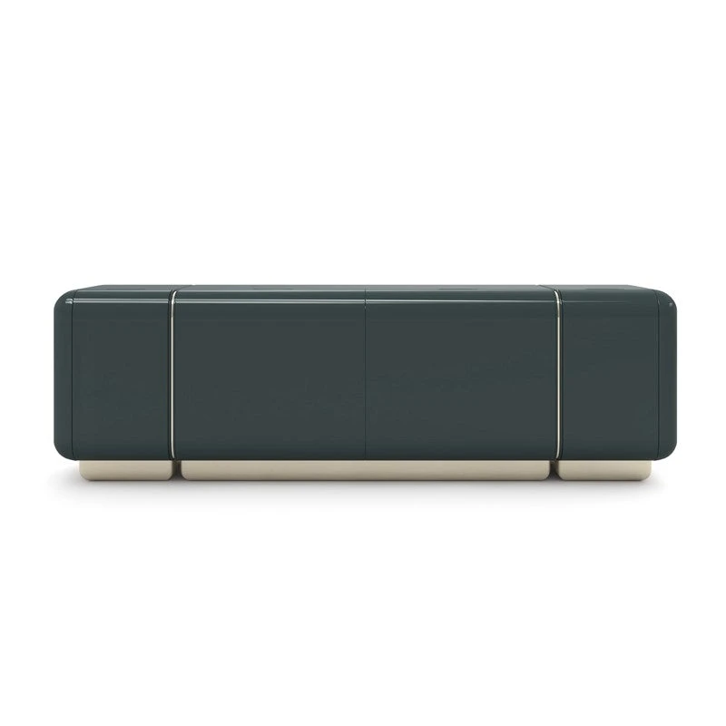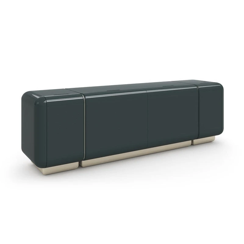 Sleek, glossy and streamlined, this piece adds a punch of rich color to any family room. Distinguished by the stunning, high-gloss Apatite Gloss finish and delicate Whisper of Gold splines, this impressive piece has four drawers with hand-pulls on top and soft-close under-mount guides. The interior is painted to match. The concave sculpting of the three-part base shimmers in Oracle leaf.