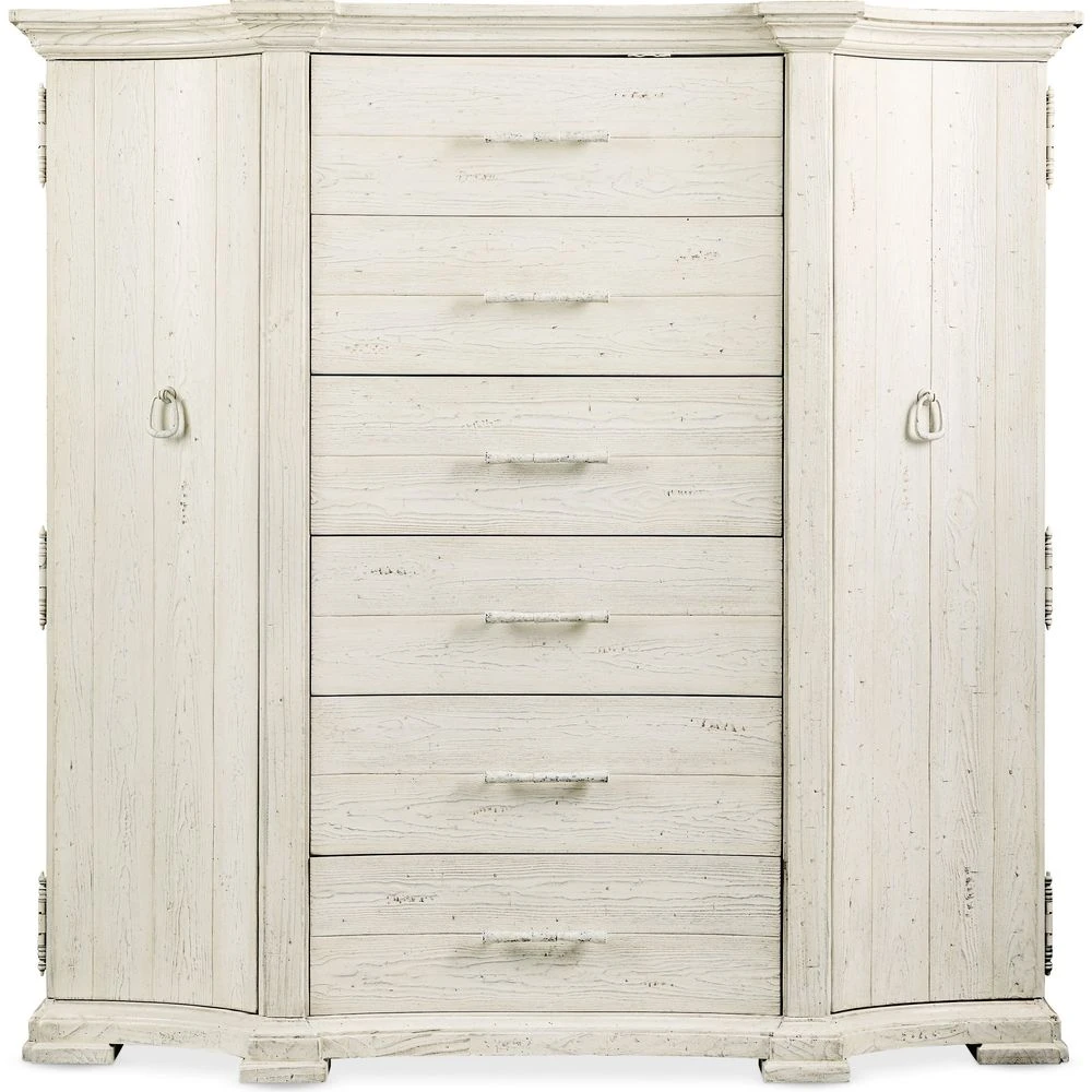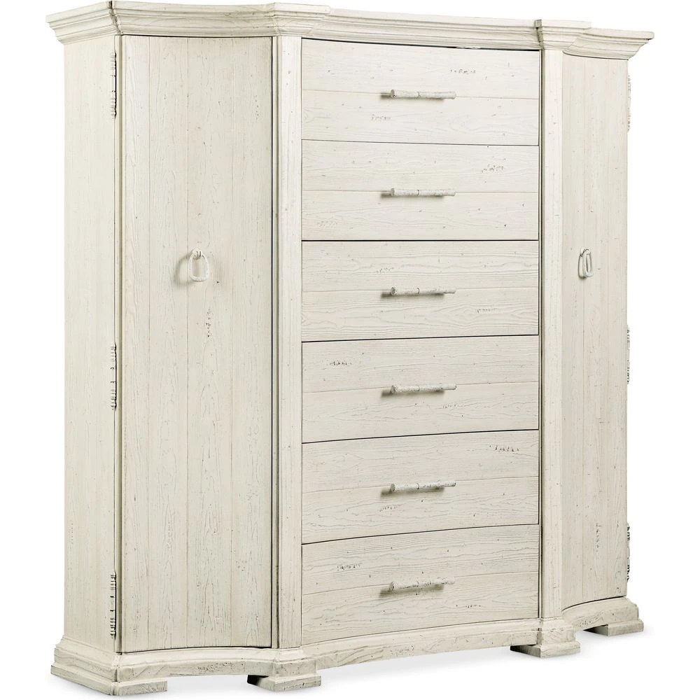 Aspirational yet approachable and classic yet modern, the Traditions Gentlemans Chest is a softly-shaped architectural silhouette in a creamy white Magnolia finish over Pine Veneers. There are six drawers, each with soft-close drawer guides, and two doors, with 3 adjustable wood shelves behind each door. The bottom drawer is cedar-lined. Inspired by a two-week trip through Europe in search of architecture and antiques full of vintage character, Hooker Furniture introduces the Traditions Collection. Targeting a design-oriented consumer with a sophisticated style, the whole home collection – one of the largest in company history – uses familiar forms to present a nostalgic, yet comfortable aesthetic. Layered with fresh elements, the group offers an updated presentation that speaks to a storied past, yet easily transitions into today’s interiors.