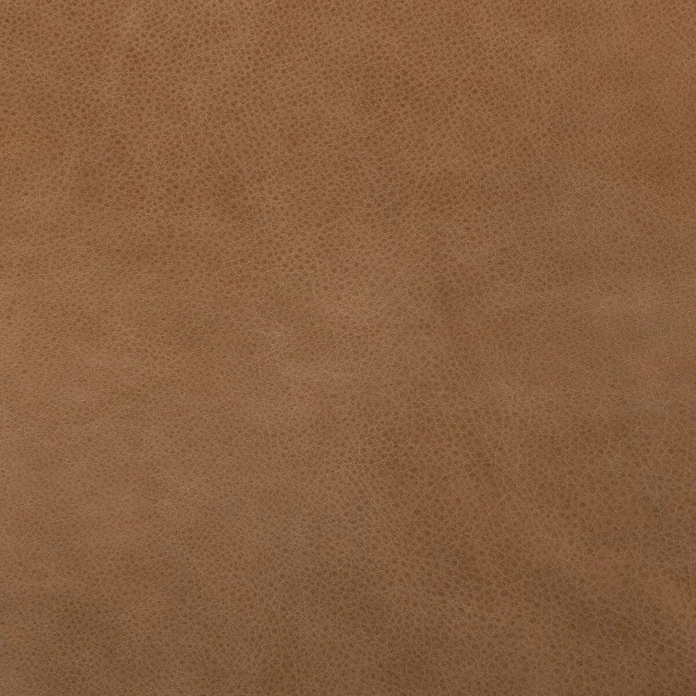 A low, spacious midcentury-style chaise is upholstered in an beautifully versatile tan top-grain leather, with blind tufting for texture.