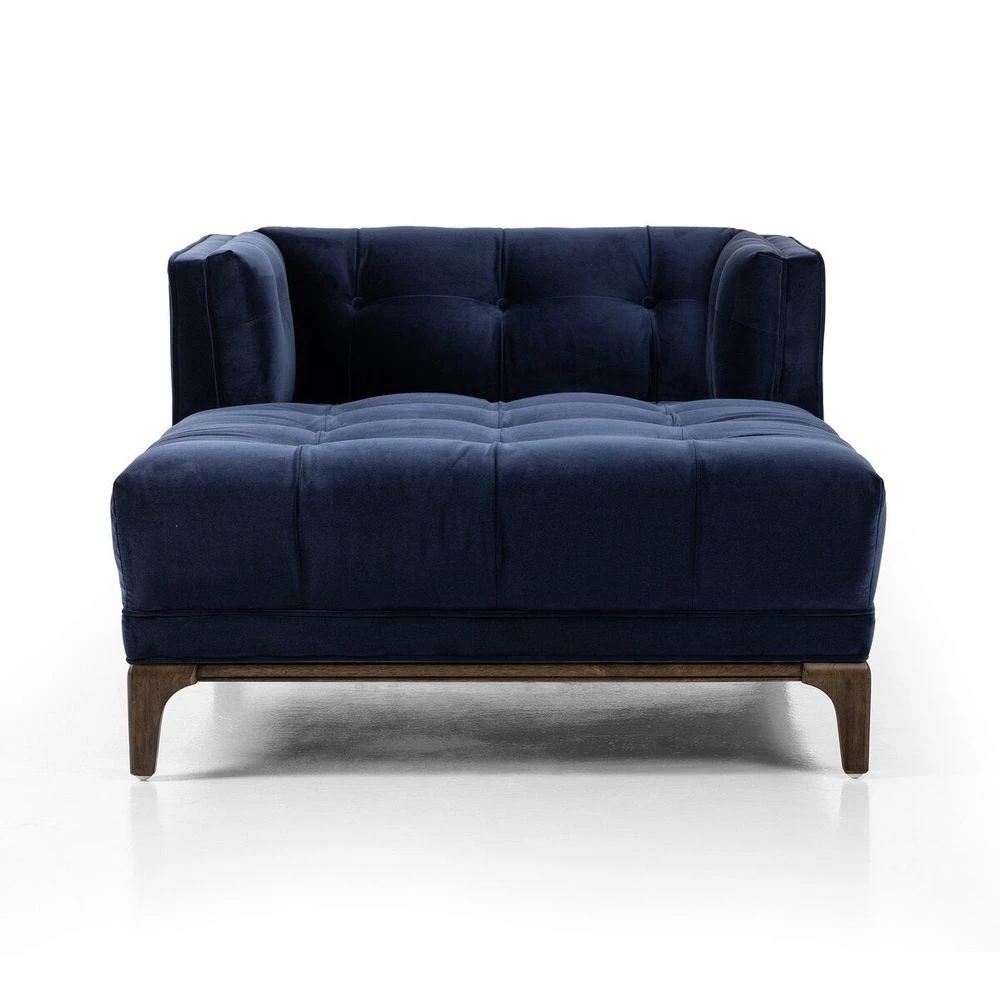 A low, spacious midcentury-style chaise is upholstered in an beautifully versatile tan top-grain leather, with blind tufting for texture.