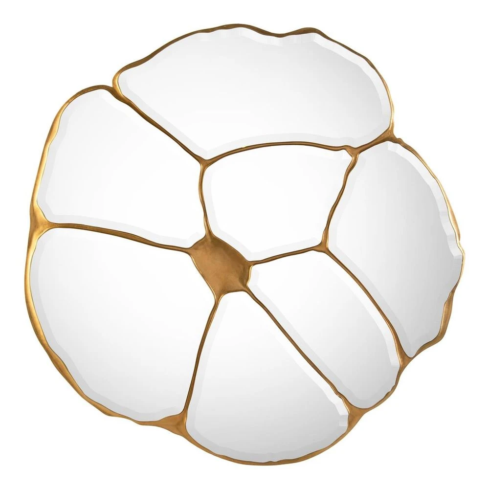 The Gilded Shards Mirror is a unique artistic statement that infuses a stunning sense of depth and dimension to an interior space. An asymmetric wooden frame showcases delicate ripples and robust edges that are beautifully elevated by a gold coast. The piece features seven individual pieces of beveled glass that appear as if the piece has been shattered, resulting in a bold design that makes an impact. The mirror is hung with french cleats and can be oriented in either landscape or portrait positions.