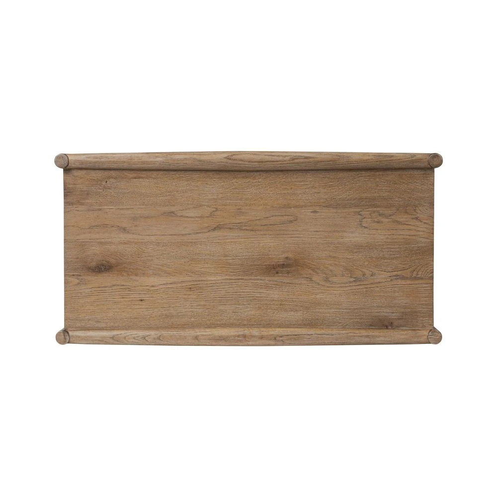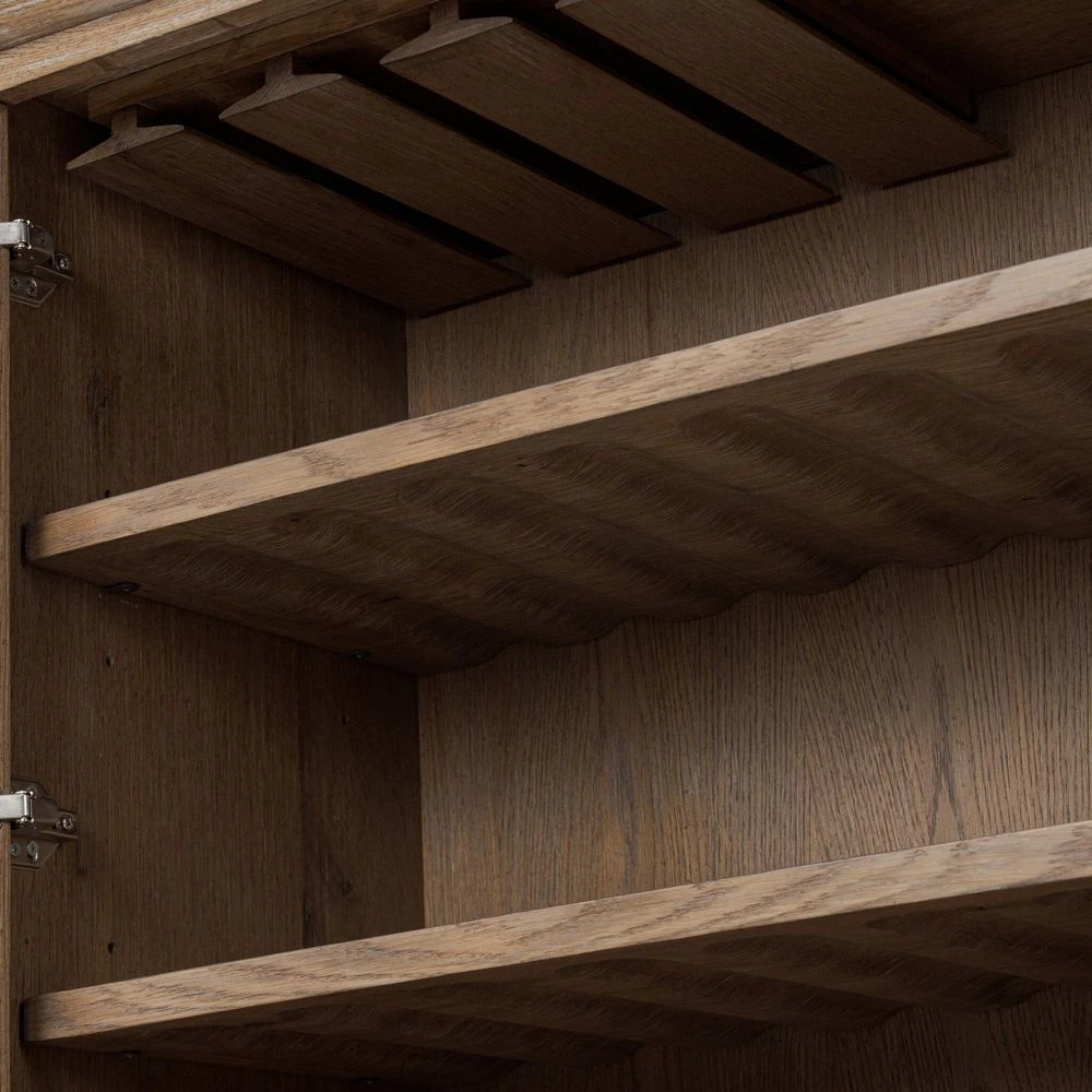 Description: A rustic oak bar cabinet shapes subtly curved corners, bringing a handcrafted look to a minimalist form. Fixed center shelves, functional drawers and glass fronts for open display. Simple hardware is finished in an aged bronze.