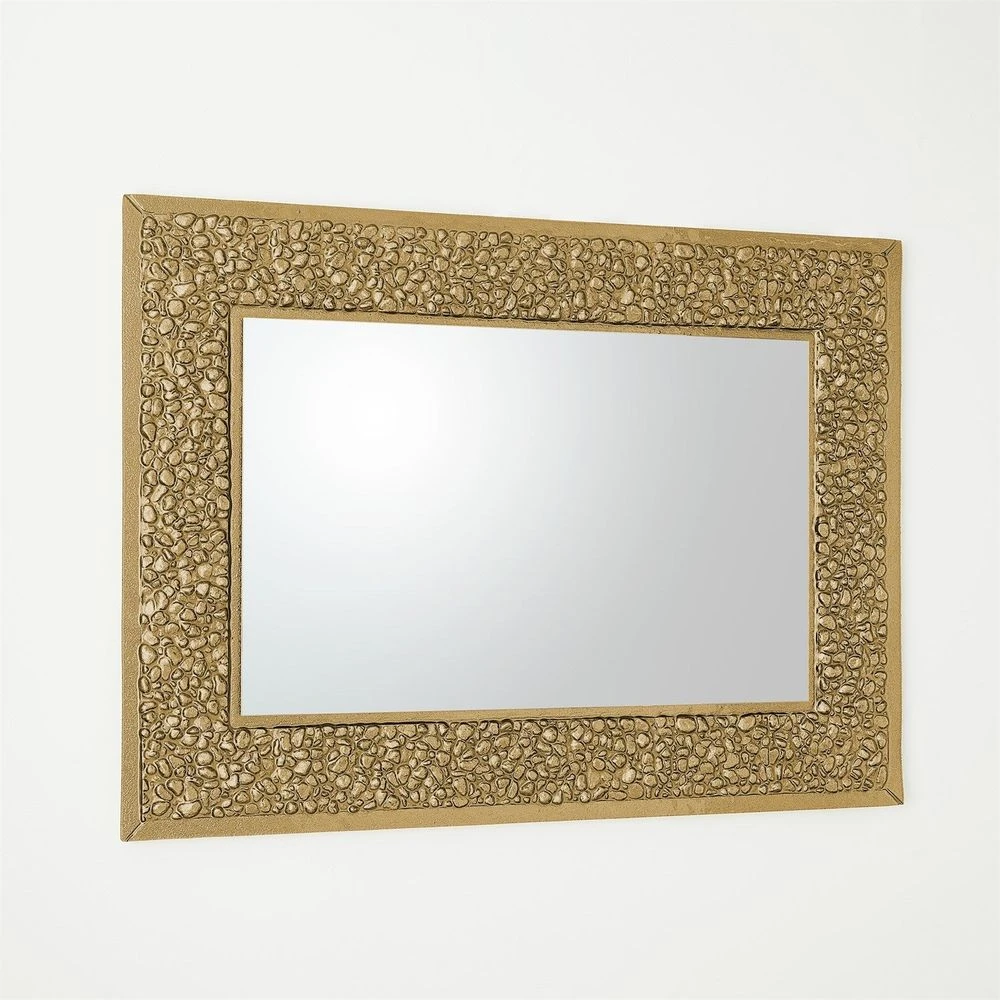 Description: The Golden Stone Mirror is a true masterpiece and a testament to the exceptional artistry of Italian craftsmen. The process begins with the placement of beautiful gold-infused glass onto a natural stone base mold. As it bakes in the oven, the glass gracefully molds itself to the unique shapes and textures of the rocks below, resulting in a mirror that captures both the brilliance of gold and the raw beauty of nature.