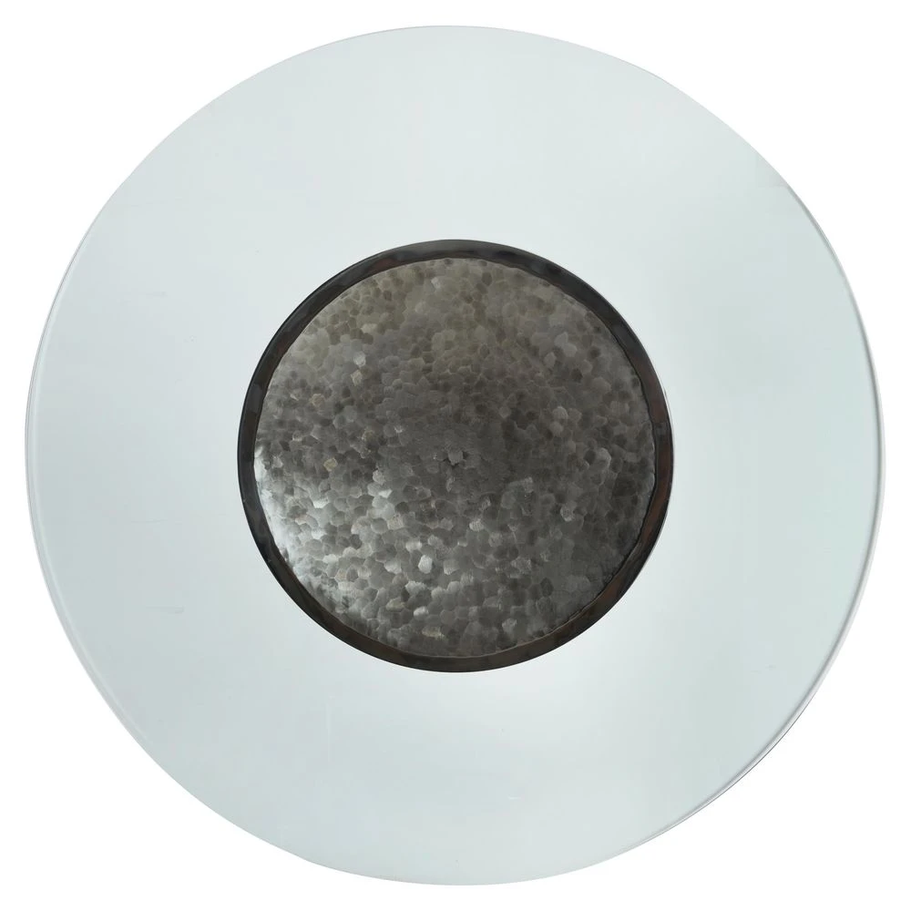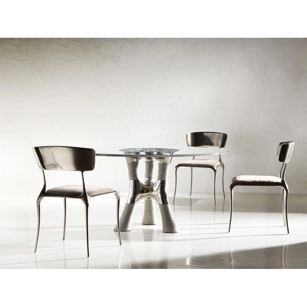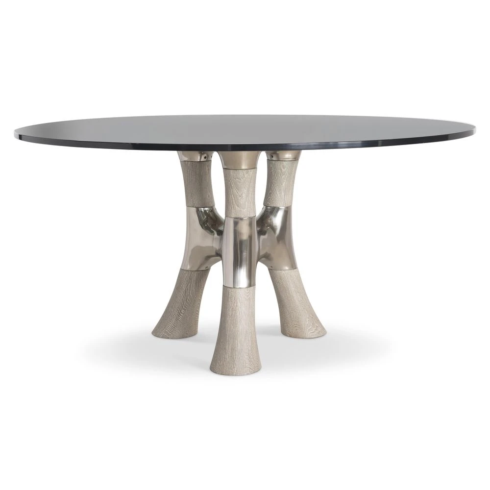 Description: A modernized faux bois design gives the Gonia dining table a distinctive style. Textured wood and polished stainless steel craft three tapered legs that support a hammered and textured metal bowl. The top is a circle of glass that offers a view of the beautiful base.