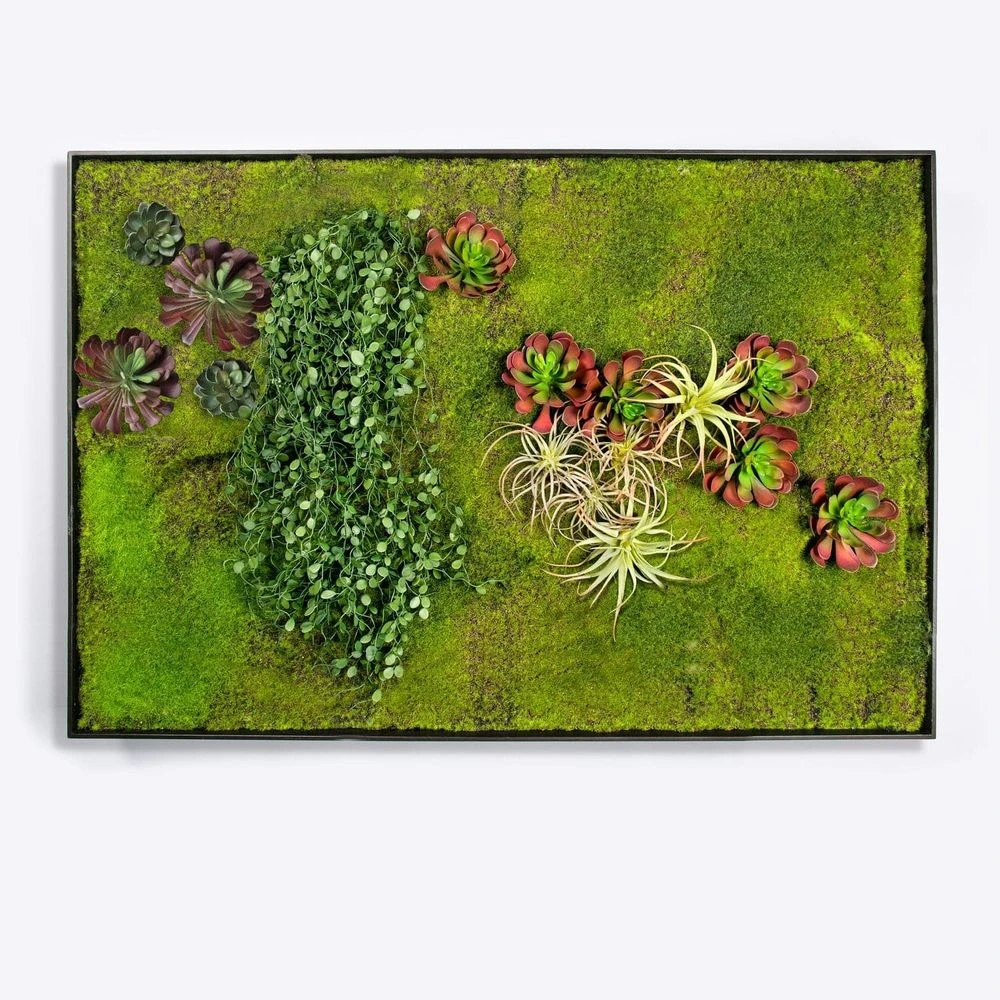 Satin black painted mdf with an open front and no glass. Use alone as a textural focal accent wall design or place side by side to create a Green Wall that will cover a large area. Hang horizontal or vertical. This design uses our permanent moss. Compared to preserved mosses, our permanent moss has a strong tolerance to discoloration and will slightly shed during installation. Even though our moss is strong, it is manufactured for indoor use only and is not intended for high light areas or direct sun. As with anything, discoloration could happen over time.
