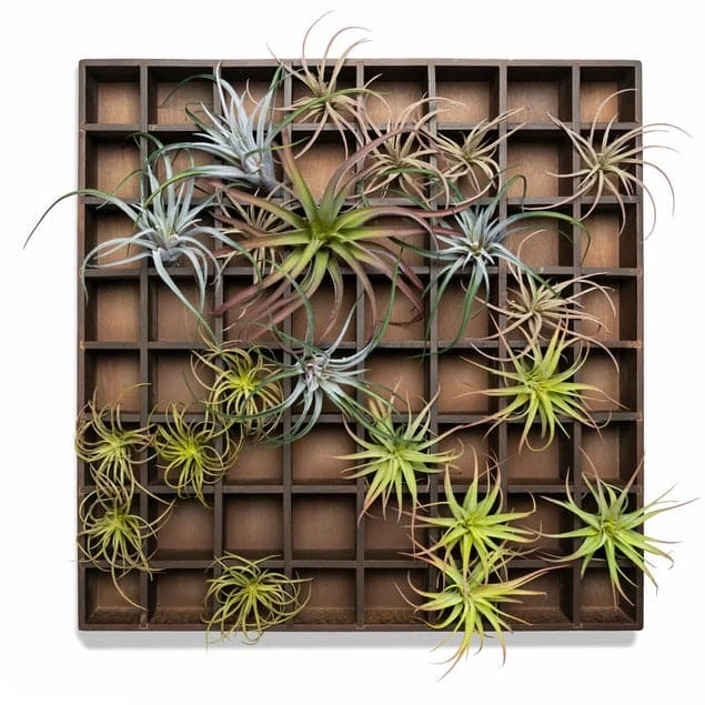 A fresh and organized approach to a green wall. Brown stained wood frame with wood grain texture, open front and no glass. Some compartments are purposely left empty to reduce price. Use alone or place multiples together to create a large wall texture. Item can hang in any direction. Hanging hardware included. Indoor only.