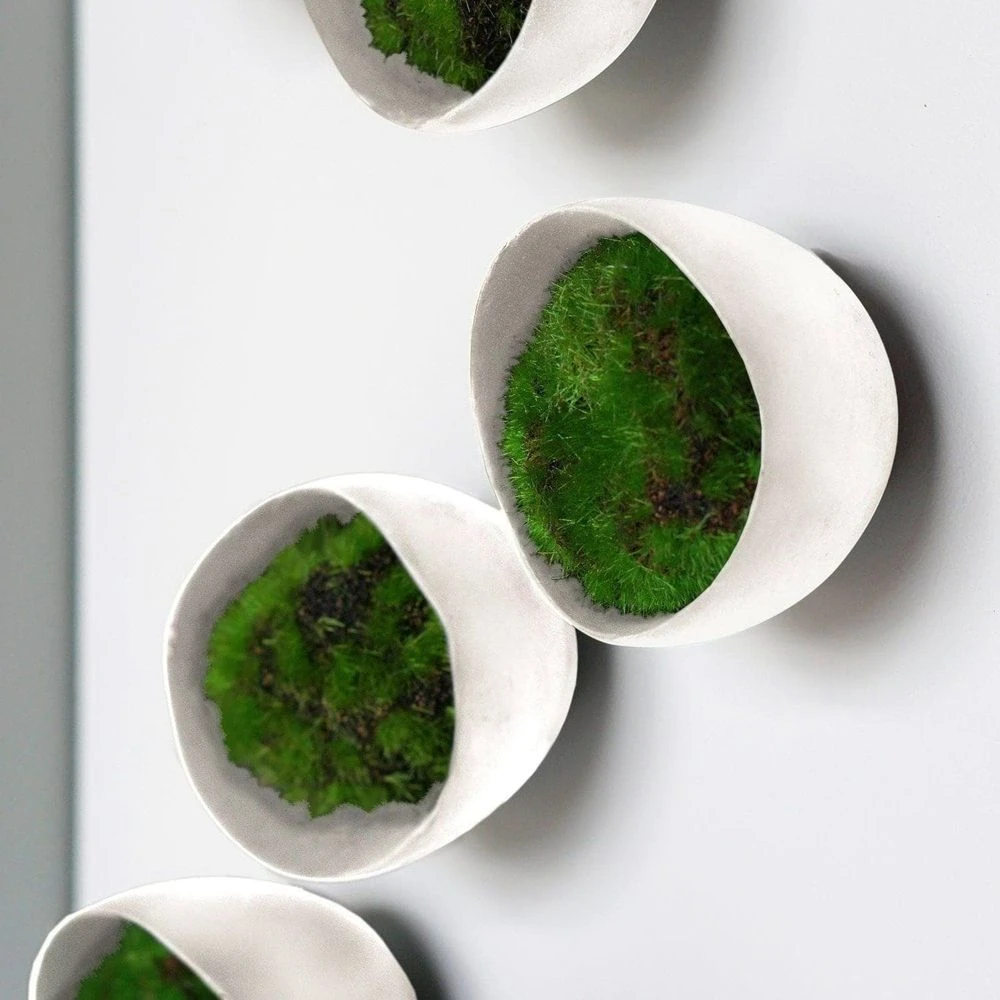 So fresh and moody! We have a variety of Wall Play styles and colors that can be adapted to hold most of our permanent air plants, succulents, and moss. Compared to preserved mosses, our permanent moss has a strong tolerance to discoloration and will slightly shed during installation. Even though our moss is strong, it is manufactured for indoor use only and is not intended for high light areas or direct sun. As with anything, discoloration could happen over time.