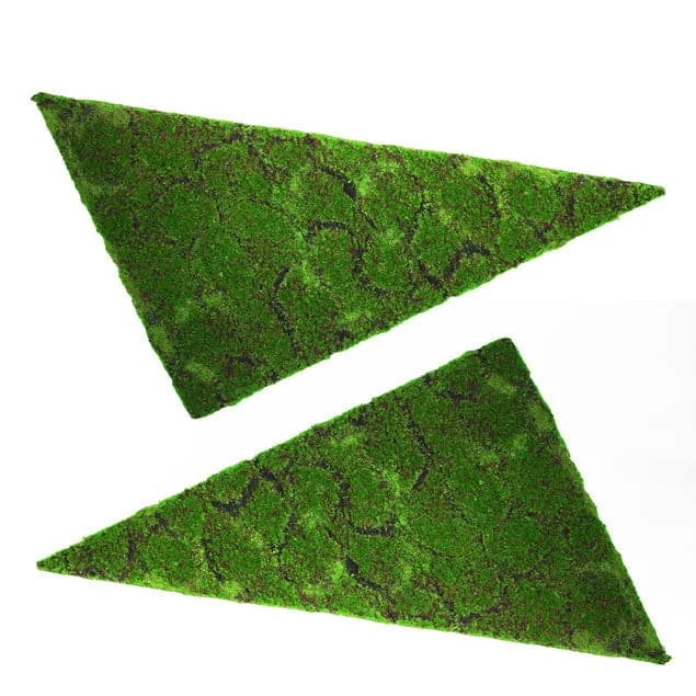 Create stability and power in your space by simply clustering multiples of our Moss Triangles. Each offers texture and sound buffering qualities (also see our moss discs and moss strips). Each polygon has thick moss wrapped edges and no frame. Compared to preserved mosses, our permanent moss has a strong tolerance to discoloration and will slightly shed during installation. Even though our moss is strong, it is manufactured for indoor use only and is not intended for high light areas or direct sun. As with anything, discoloration could happen over time. Contact us if you require a customized size, shape, color, substrate, pattern, or technique. Hanging hardware included. Indoor only.