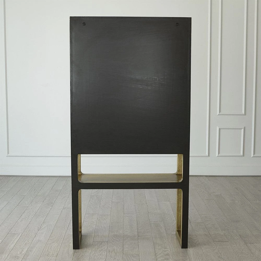 With an intricate design of selenite minerals on the front panels in a sunburst pattern, The Gypsum Bar Cabinet has a base covered in brass metal sheeting, cast aluminum hardware, adjustable European hinges, interior mirrored back and glass shelves.