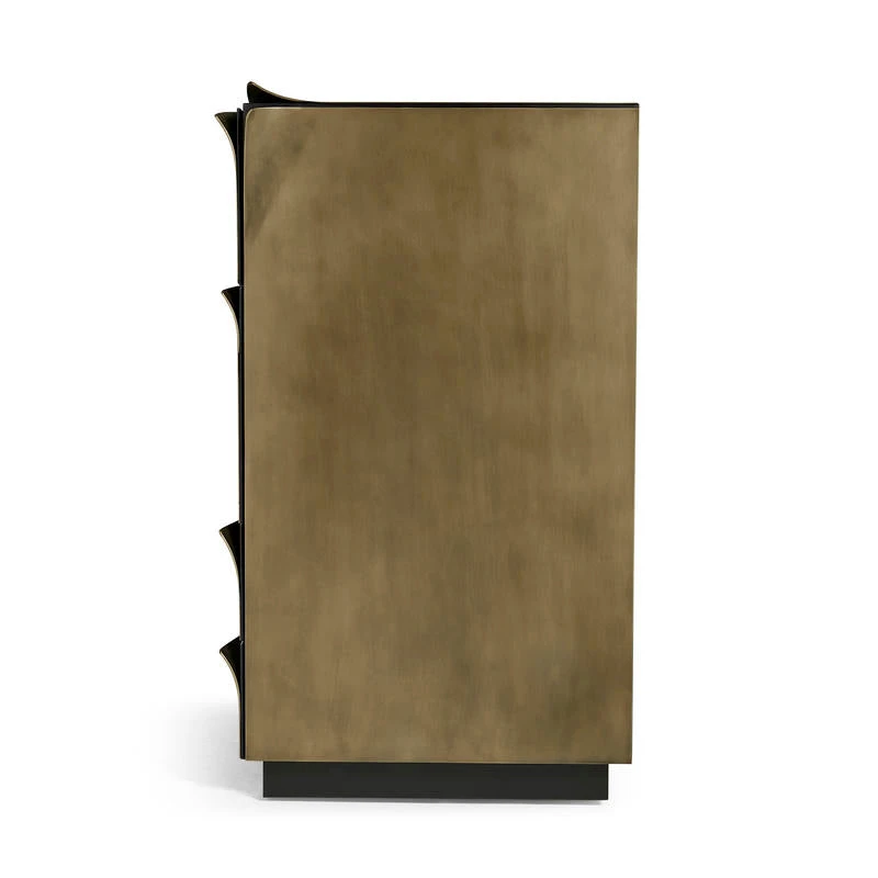Description: All sided feature bent brass sheets. Eight (8) drawers for storage. Drawer fonts feature bent brass sheets that create integrated hardware. Plinth style base
