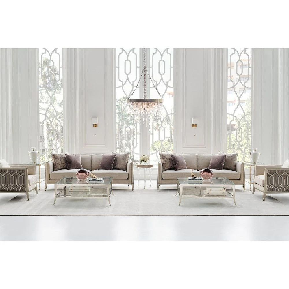 Every time you see the Just Duet sofa, you’ll remember the remarkable story behind its design inspiration. Its sumptuous seating area is bordered by a one-of-a-kind wood frame featuring carvings inspired by the patterns of a palace balcony railing in India. The layering of metal fretwork behind the wood was inspired by the dual shadow cast on the balcony by the setting sun as seen through the railing’s design. Creating a high fashion look unique to itself, these elements are highlighted with illuminating shades of Soft Silver Paint and Champagne Gold. Exquisite fabrics and touchably luxe accent pillows complete its appeal.