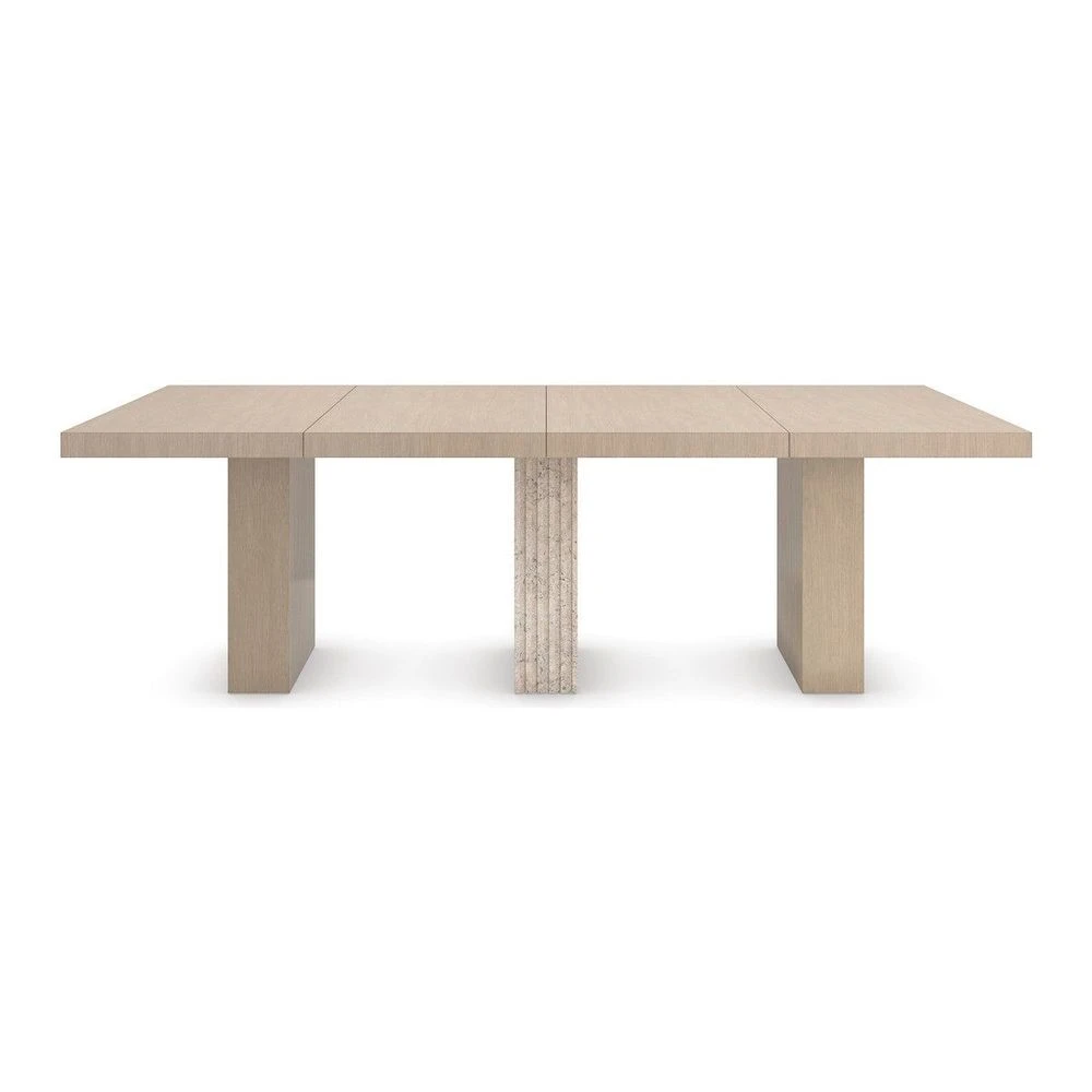 Form and function in perfect harmony: the Unity light dining table celebrates a simple yet intentional use of organic materials. Architectural lines are punctuated by a pillar-style base with hand-carved fluted details in a mix of Sun Drenched Oak and Open Pore Travertine stone. Style as a small pedestal for an intimate dining experience, or expand with two leaves for a larger gathering of guests. Table seats 10 when fully extended.