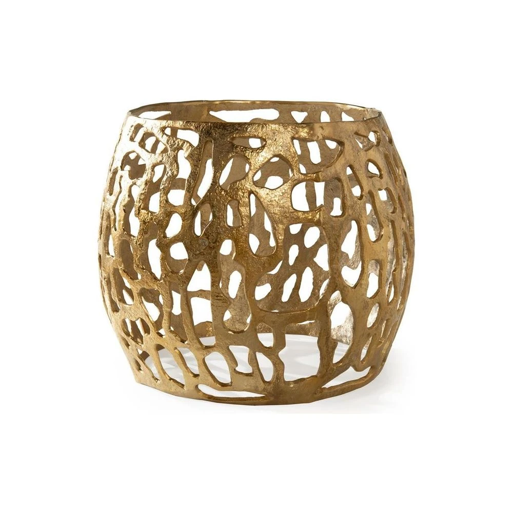 An organic cast aluminum dining table base with an antique gold finish gives aesthetic interest with its free-form cutout pattern.