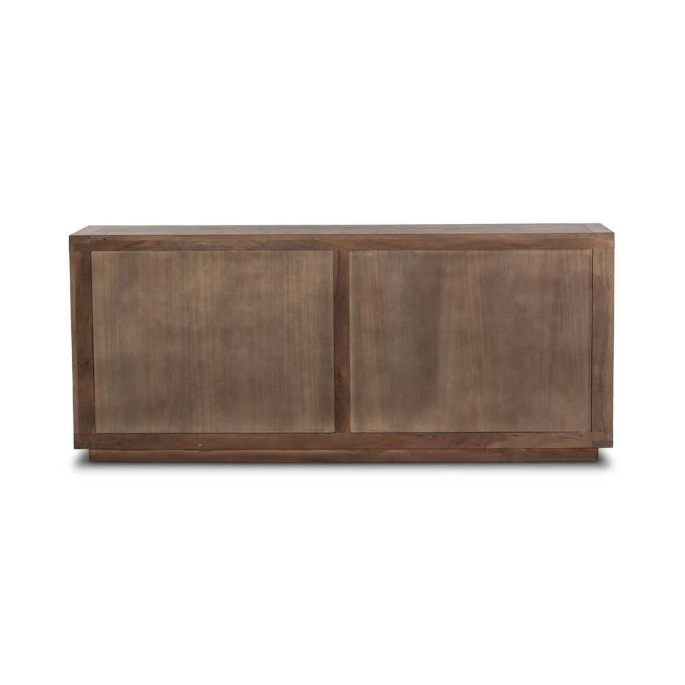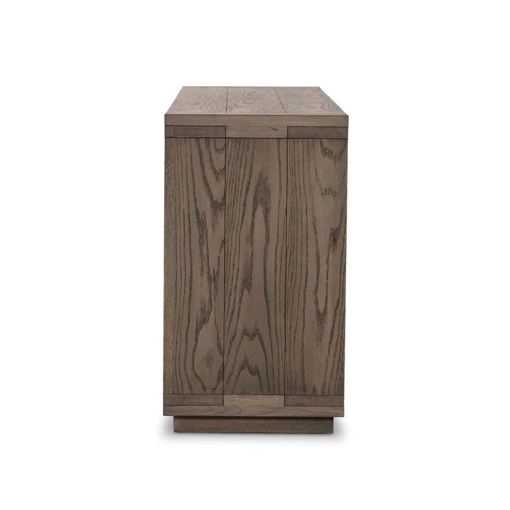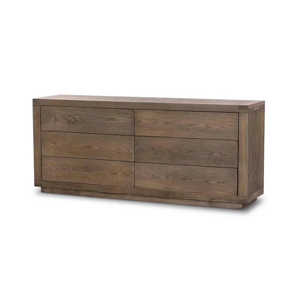 Worn oak shapes a streamlined box-style dresser, with lap joint corners for a detail-driven touch.