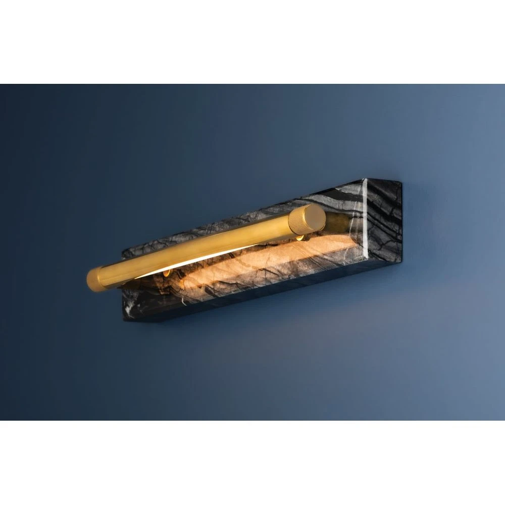 Hayden is where clean, precise design meets elevated, high-end materials. An aged brass tube with exquisitely detailed knurled ends rests upon a rectangular base of gorgeous honed nero madera marble. Versatility at its finest, hang Hayden vertically or horizontally; use it as a bath bar or a picture light. Available in three different sizes to work with any wall space.