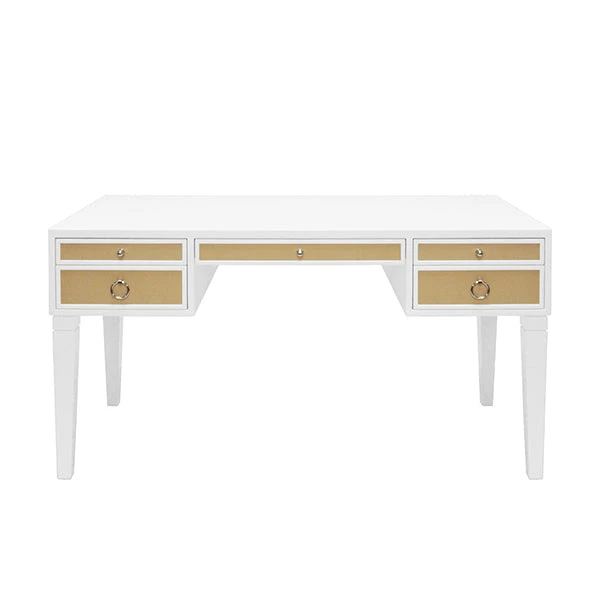 Description: Some may say the Heidi desk was designed solely to revive the lost art of penmanship – but whether you use it for writing letters or emailing them, you’ll love the exquisite luxe tailoring in any contemporary home office. Contrasting natural grasscloth drawers add an organic feel to this timeless, matte white lacquer frame. Polished nickel hardware completes the look.