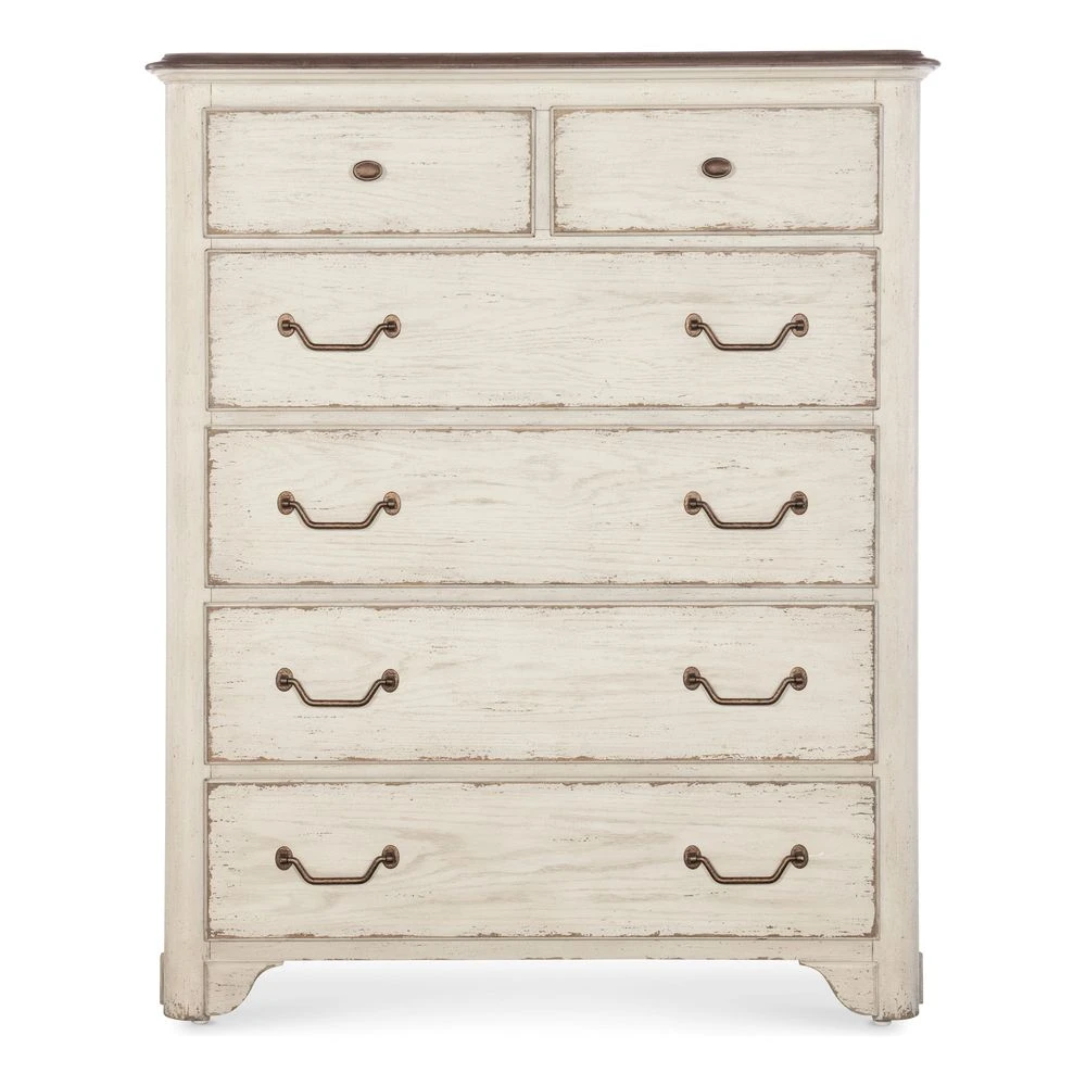 Description: In a two-tone finish with the time-worn white Daisy on the case and the warm Honey on the top and on the drawer interiors, the Heritage Dresser is a classic, charming design with a nostalgic flair. The six self-closing drawers have top drawers with black removable felt liner and a bottom drawer that is cedar-lined. Metal alloy pulls in an antique bronze finish.