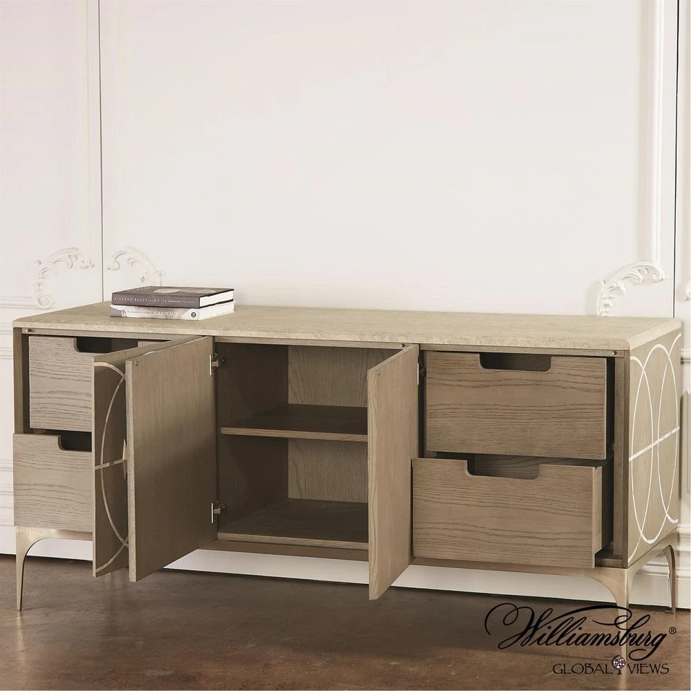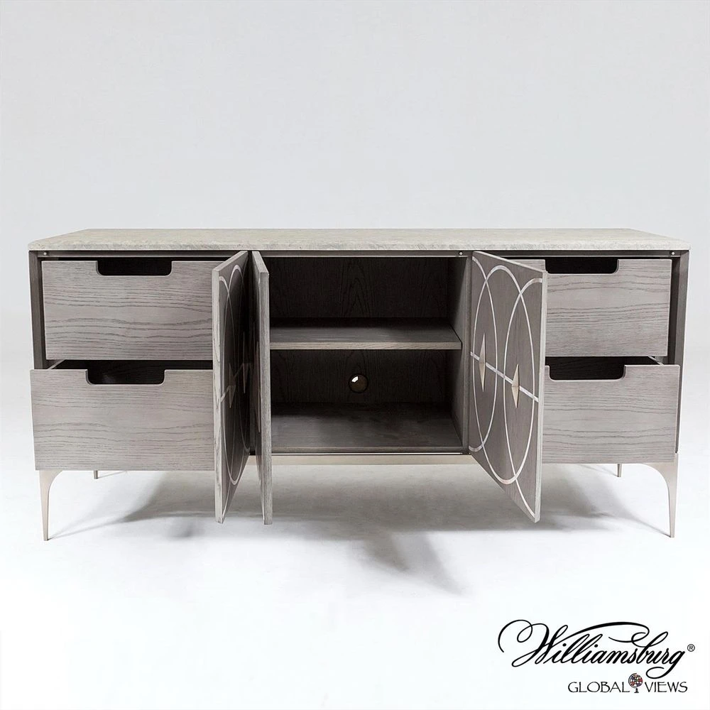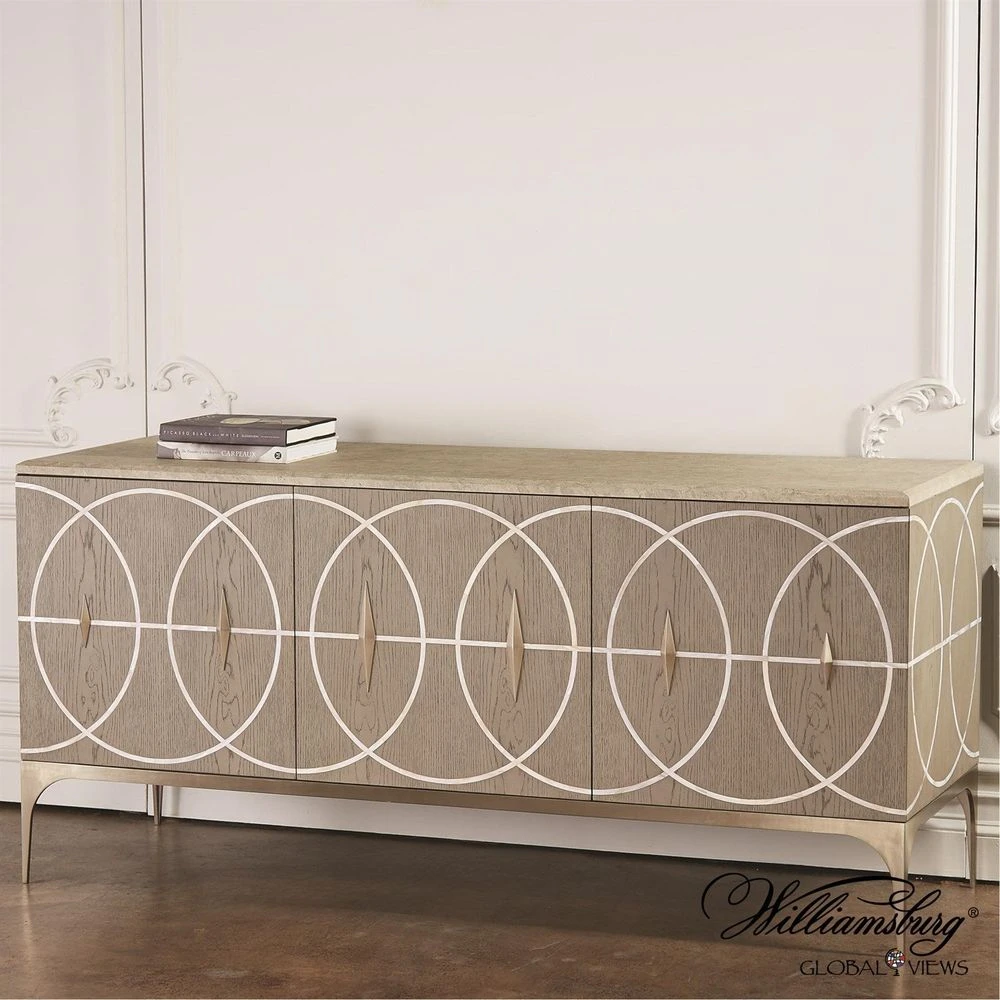 Londons parks offer green oases within iron fences. Our Holborn collection is inspired by a design for an iron fence in a rare architectural book–originally published in the High Holborn area of London–in Colonial Williamsburgs library. Such neoclassic circular motifs–inspired by designs used in Roman interiors discovered at the excavations of Pompeii and Herculaneum–were popular in the late 18th and early 19th centuries. Weve translated the designs iron circles into mother-of-pearl inlay, and its iron spikes to nickel handles for an update on designs popularized by tastemakers such as Robert Adam, Thomas Sheraton, and Thomas Jefferson.