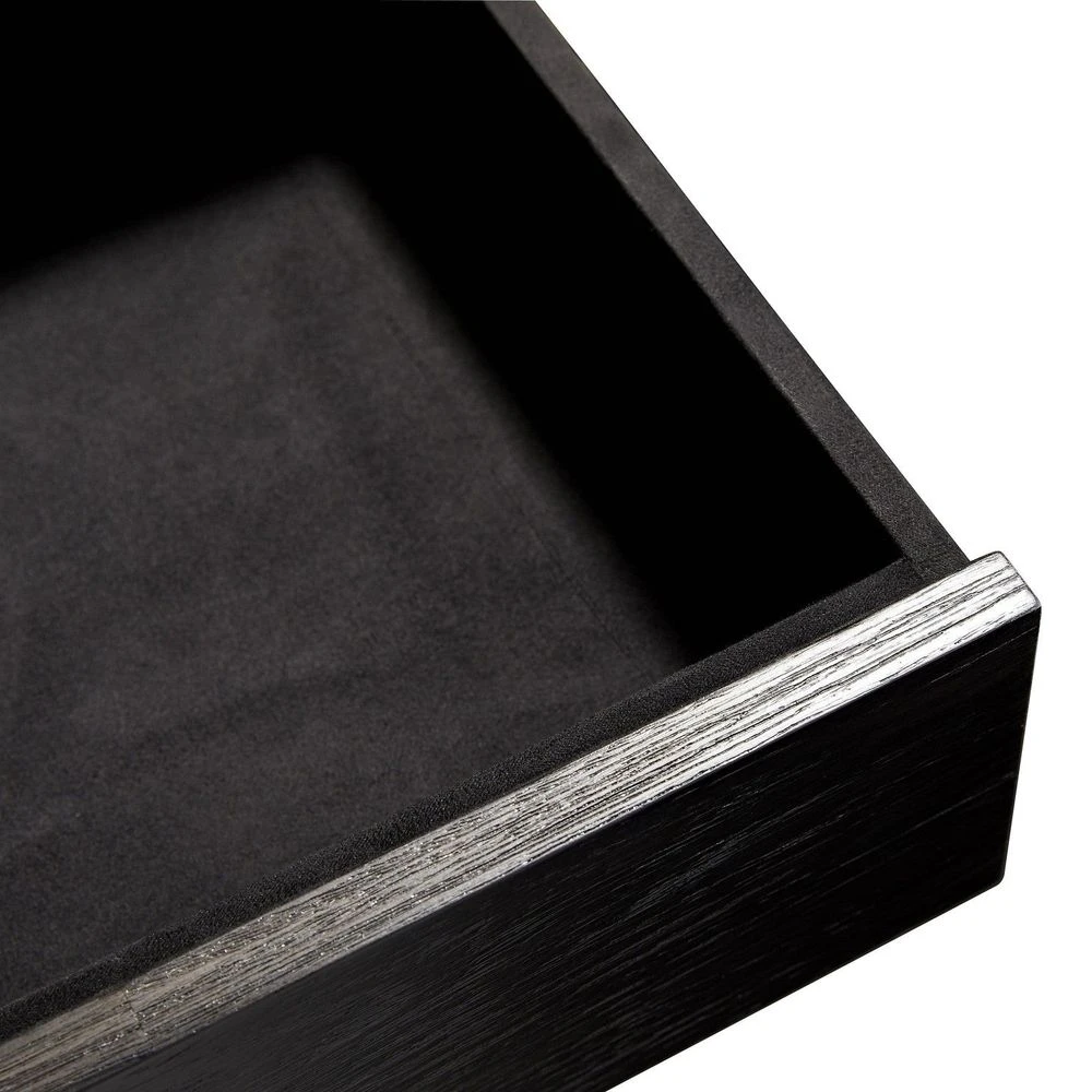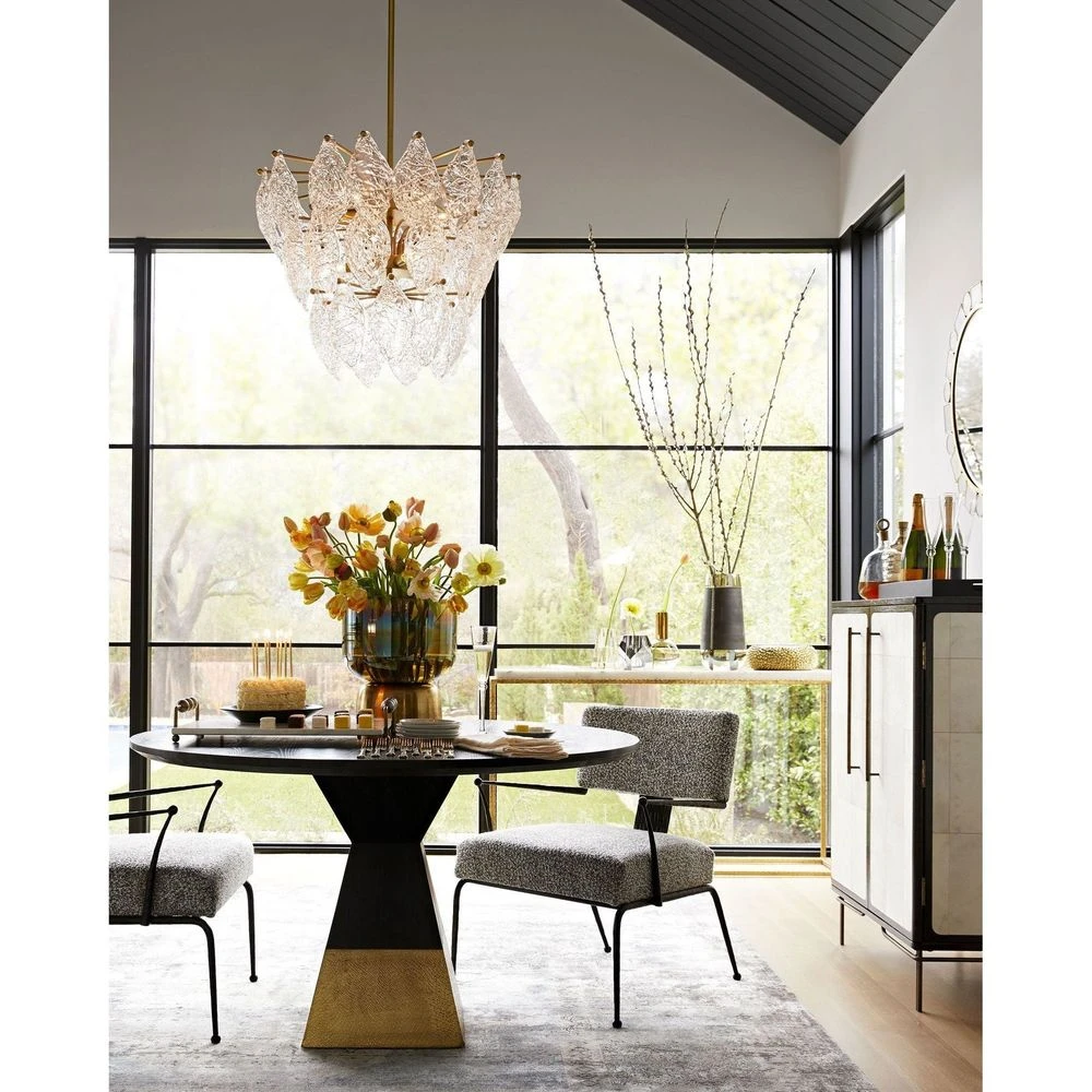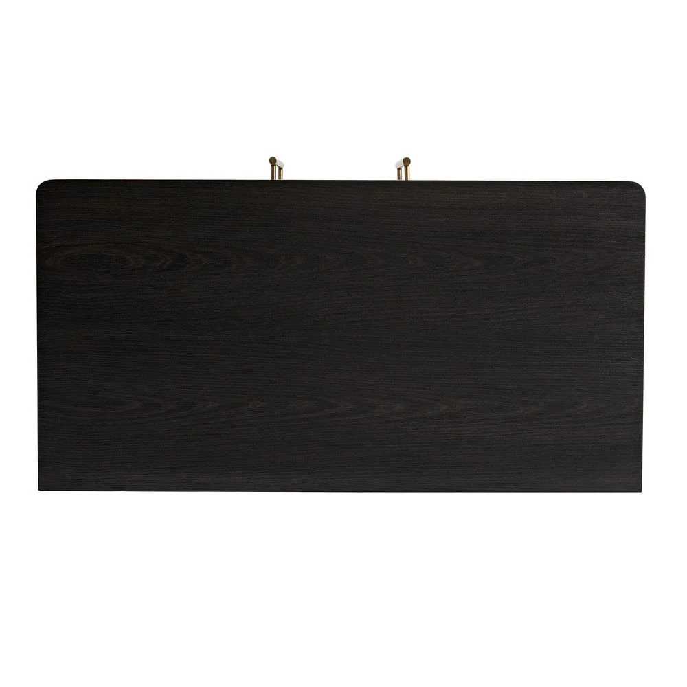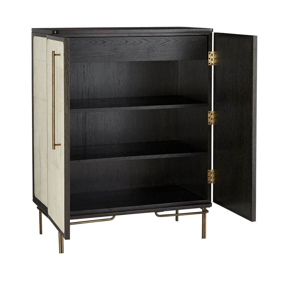 A study in architecture and design the Francesco delivers style and function. This deco-inspired cabinet features an antique brass steel base that showcases an ivory vellum-paneled façade framed by solid oak in an ebony finish. Linear handles finishedate this piece while rounded edges soften its quadrangle form. Its versatile aesthetic easily blends into any style decor. Use as a bar cabinet to stylishly store spirits or as a contemporary solution for concealing collectibles. Finish will vary.