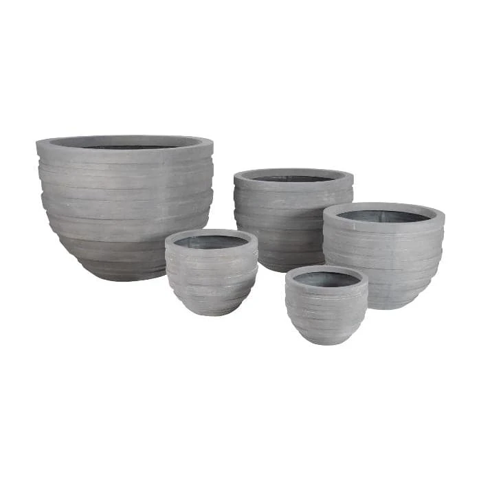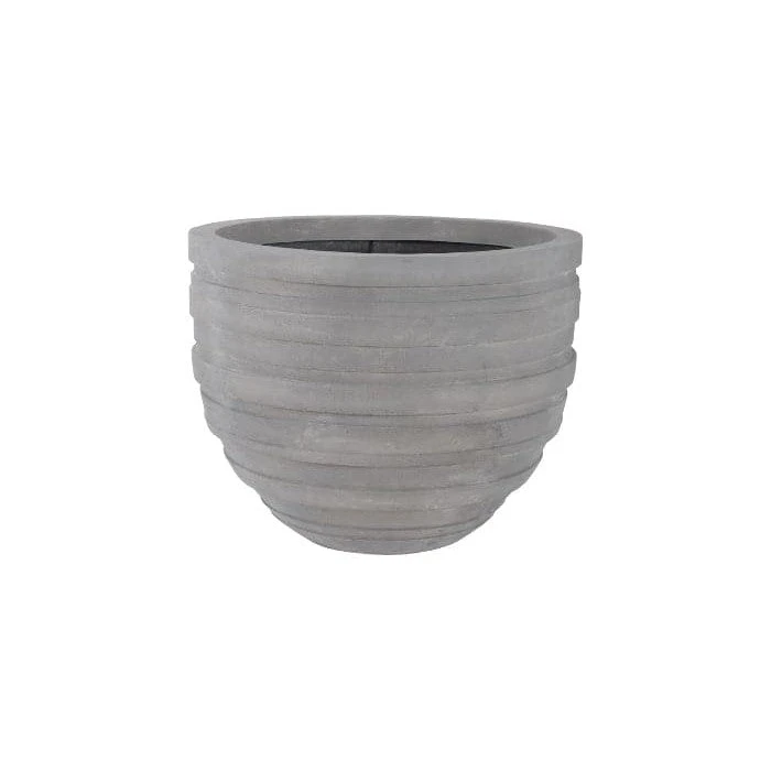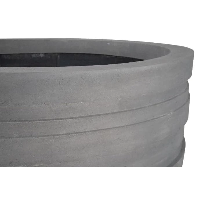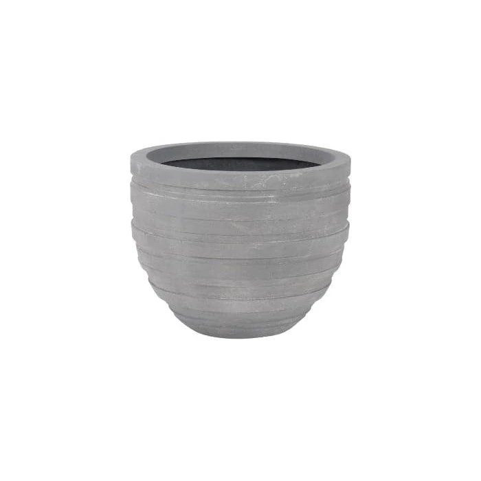 The June Large Raw Gray Planter looks like a vintage planter with its raw gray finish. Made of composite, its surface is striated to mimic fabric that has been wrapped around a vessel and slathered in a beautiful papier-mache treatment. One of the loveliest aspects of this design is that it is strikingly contemporary for a garden planter thanks to its warm gray finish and the top lip that rolls into its interior to leave the shape clean-lined. We offer this gray garden planter in a number of sizes and we have white planters in round and square shapes. Each of these reflects the ethos that Phillips Collection personifies: modern organic.