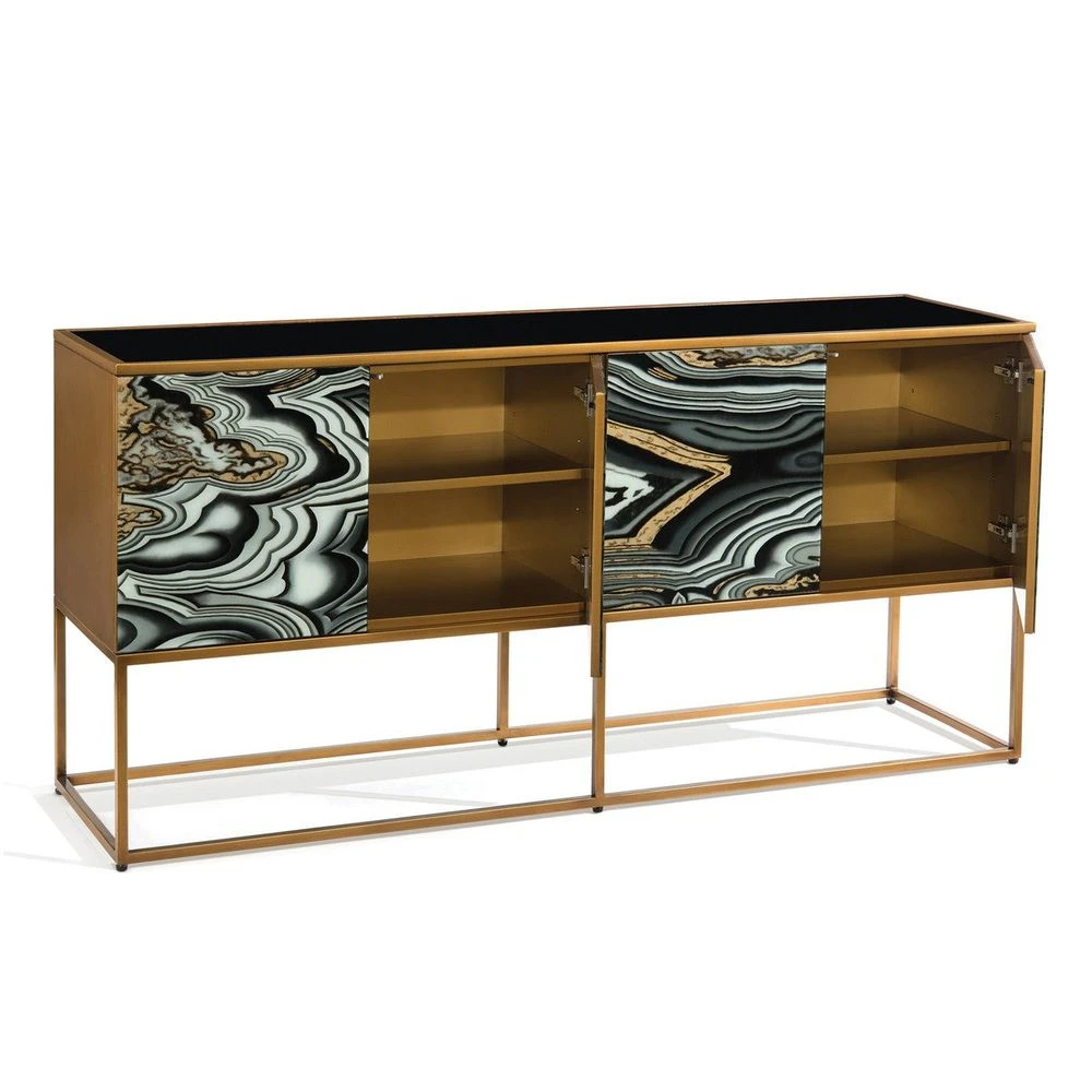 Description: The agate design running across the front of the doors is reverse-hand-painted, above which is a black glass top inset in an Aztec gold frame. The base is also finished in Aztec gold.