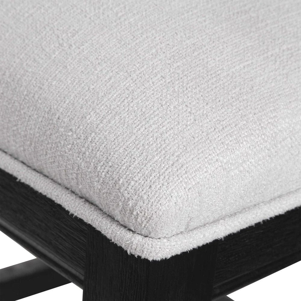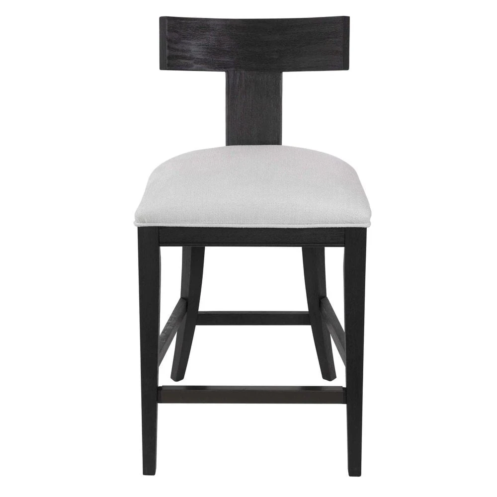 This modern take on a klismos design features a curved rubber wood frame that has been wire brushed and rubbed in a charcoal black stain, paired with a white slubbed performance fabric cushion. The seat height is 26″.