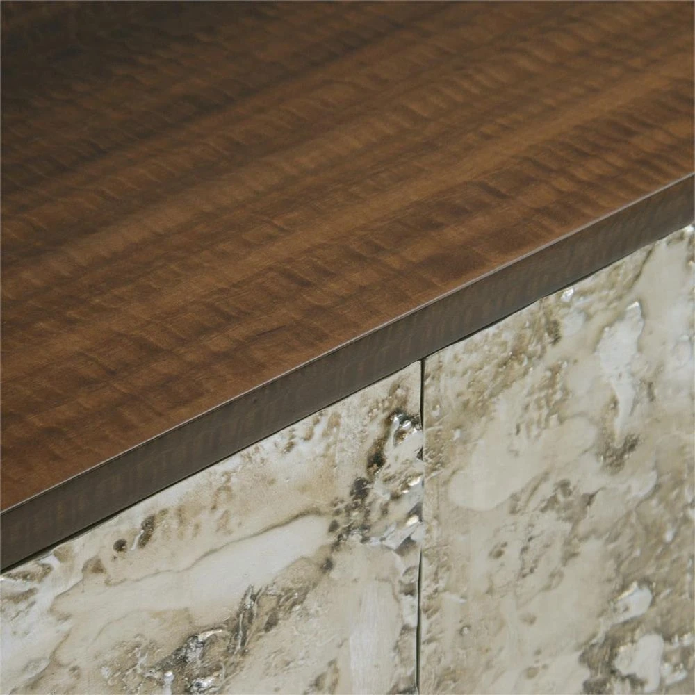 This modern, five-door sideboard features a case in smoked, figured eucalyptus veneer mounted on a pair of steel bases in dark bronze. The door fronts carry a resin pattern of molten silver in a patinated finish.