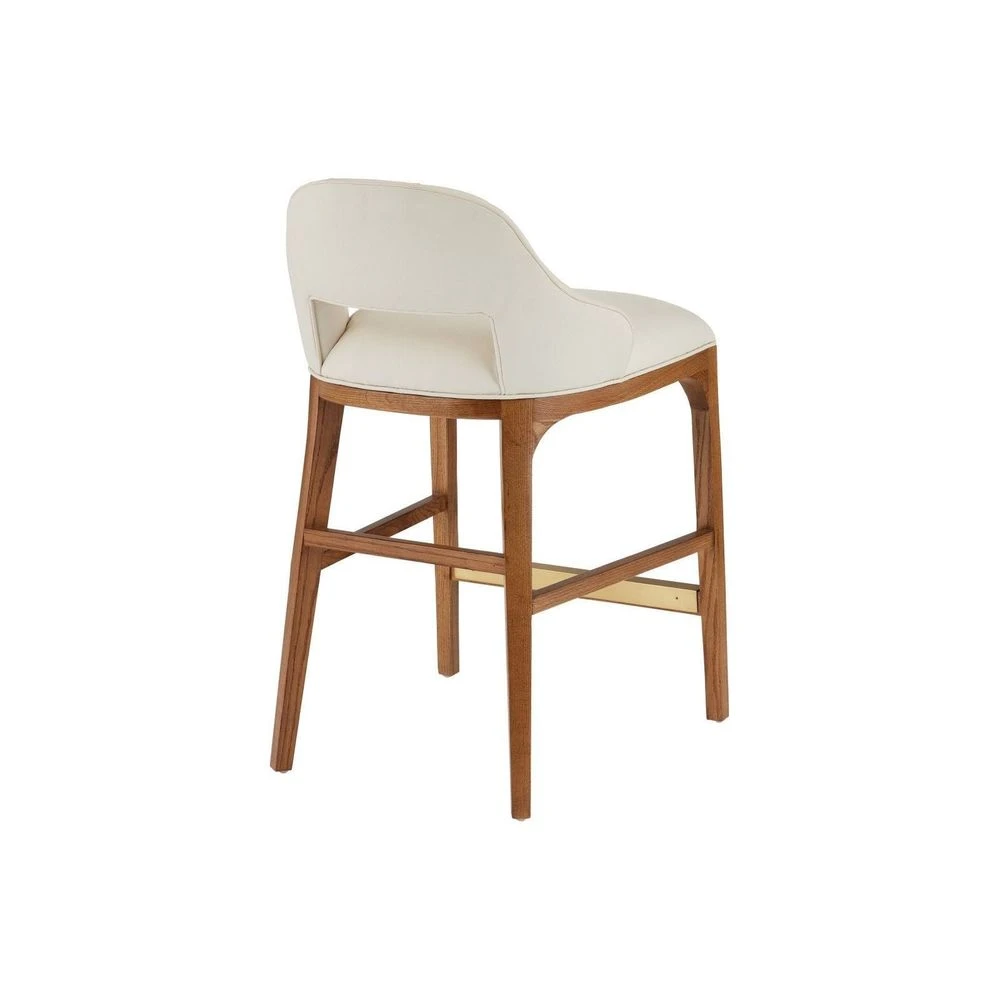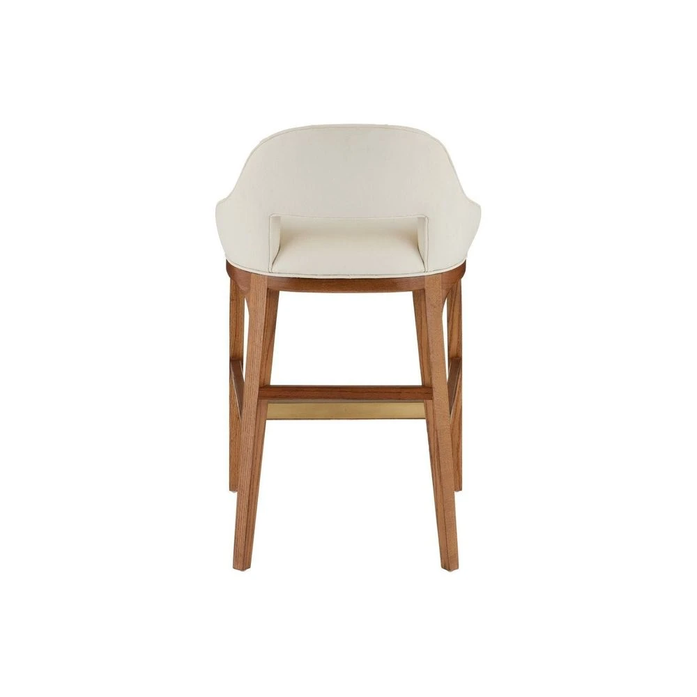 Description: The Inga Counter Stool, covered in Endurance Sand fabric, has an upholstered back and seat that sits nimbly atop a solid white-oak frame in a morel brown finish. The paleness of the fabric and the warmth of the wood are contrasting elements. A brass kick plate on the front rung in a brushed brass finish serves a purpose and brings a bit of brightness to the design by Aimee Kurzner.