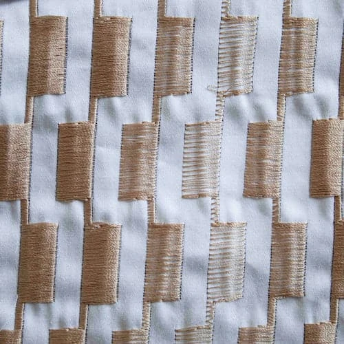 Tiny rectangles of embroidery dance across this 100% cotton fabric. Available in palladium and gold, two very precious metals.