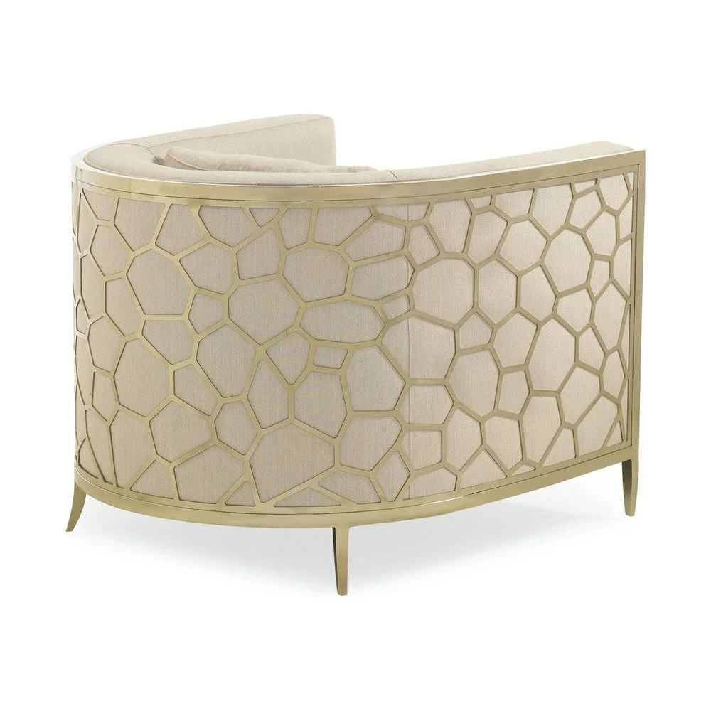 Get the party started with a chair they’ll be talking about long after they leave. We design our product with our clients’ satisfaction in mind. Custom engineered frame wrapped in a Gold Bullion metal tone. A micro-herringbone pattern in off-white linen-blend fabric offers simplistic beauty.