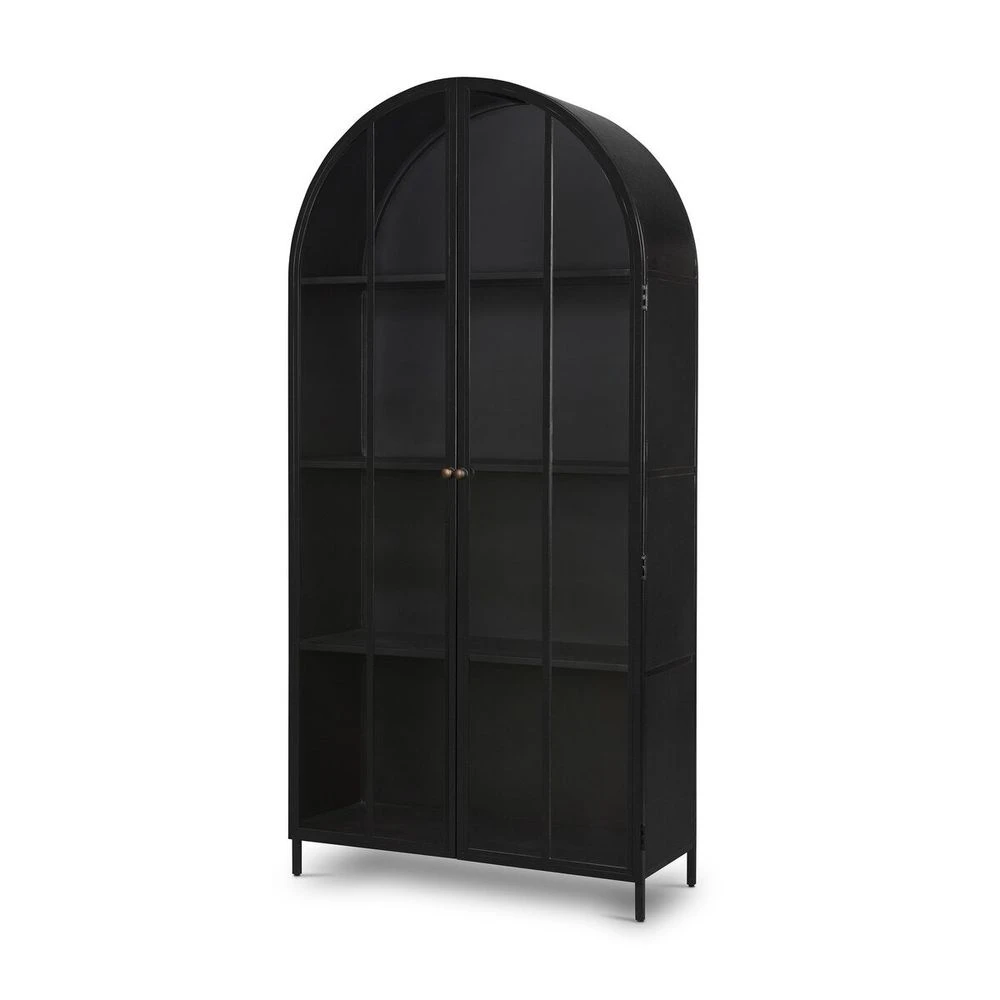 Showcase meets storage in beautifully arched cabinetry of black-finished iron and tempered glass, finished off with simple bronzed hardware.