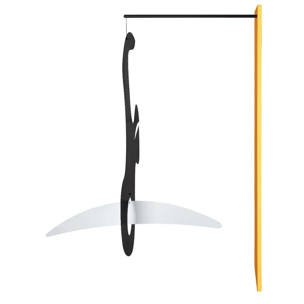 Part sculpture, part mobile this piece will be the focal point of any room. A black, amorphous form hover in front of a yellow backdrop, with a white piece emphasizing the three dimensional aspect of the sculpture.