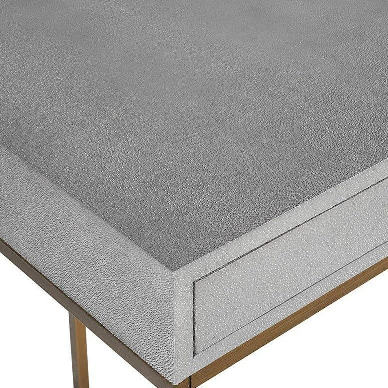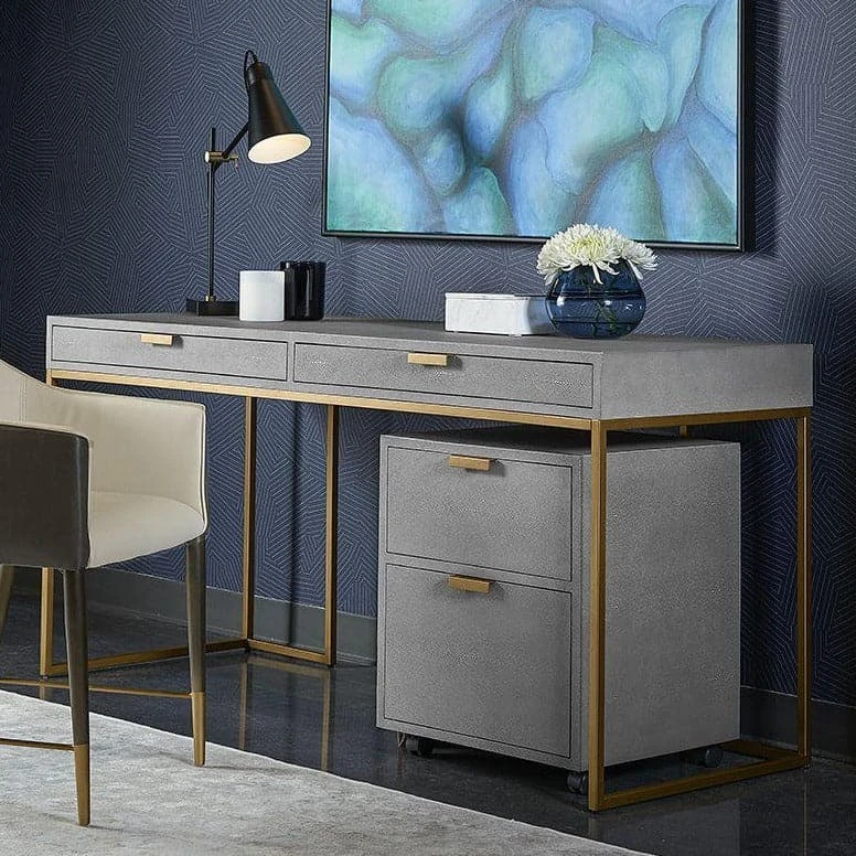 Design a space for creativity with this eye-catching desk from our MIXT collection. Covered in bonded leather with a textured shagreen finish and antique brass hardware. Two drawers offer ample storage. Pairs beautifully with coordinating file cabinet.