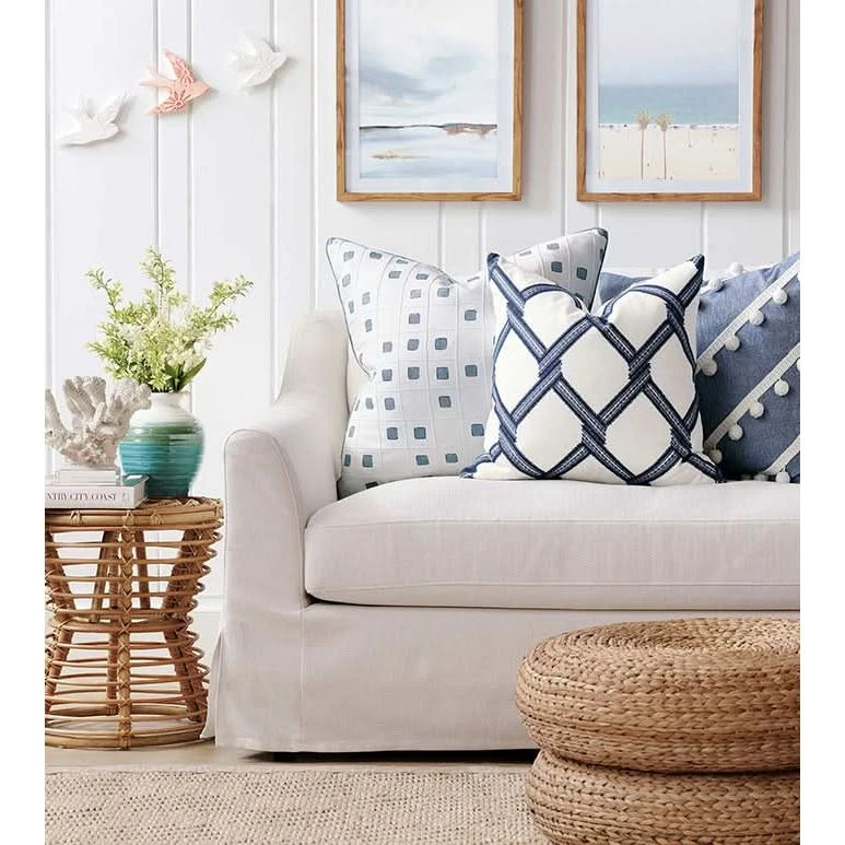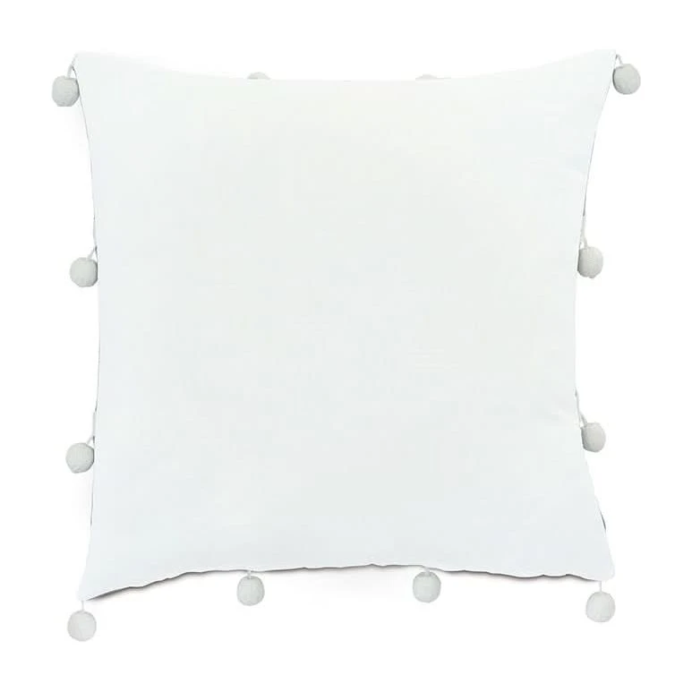 - Blue decorative pillow in a woven, abstract stripe fabric with diagonal ball trim