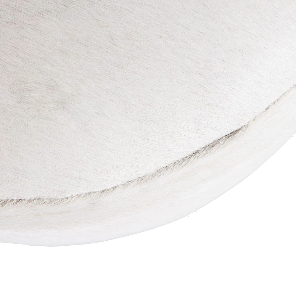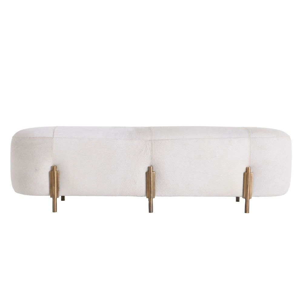 Dramatic and lush, this Art Deco inspired bench is the highlight of any space. Antique brass cast aluminum legs elevate a plush, capsule-shaped white hair-on-hide seat, combining rich texture with a hint of glamour. Hide will vary.
